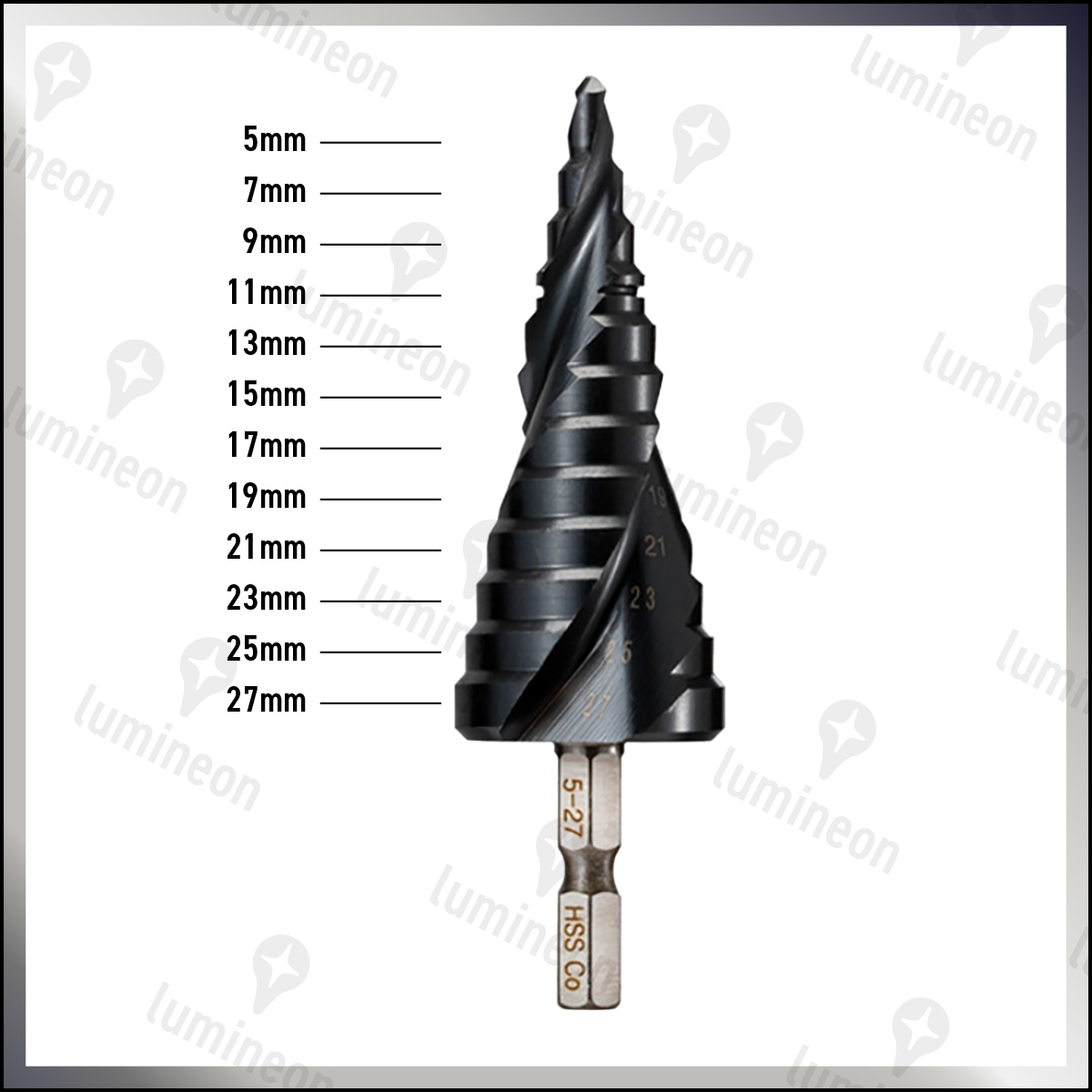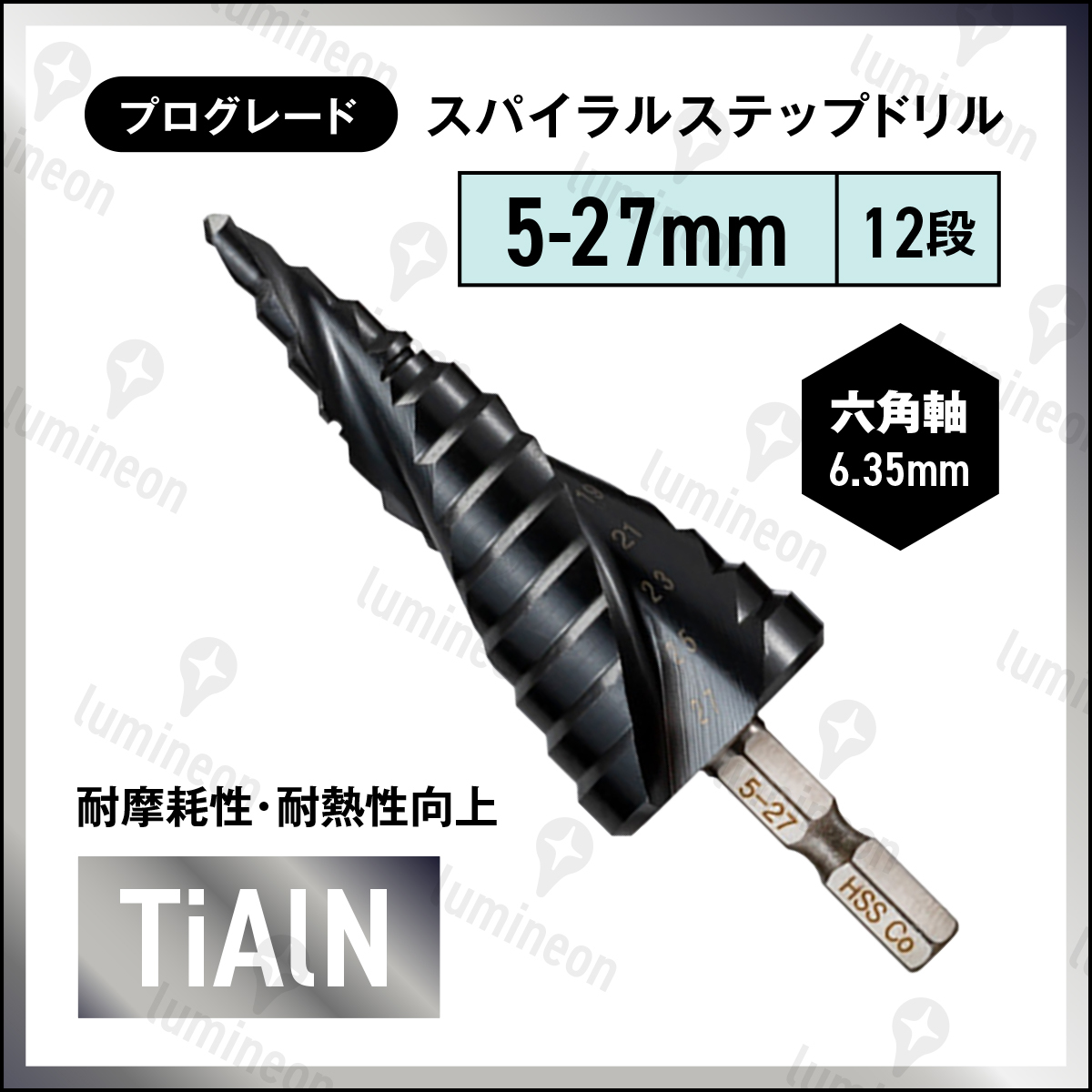 ステップ ドリル スパイラル ステンレス用 チタン 5-27mm ビット ドリル 刃 鉄工 用 金属 六角軸 穴あけ 先端 工具 下穴 タケノコ g031c