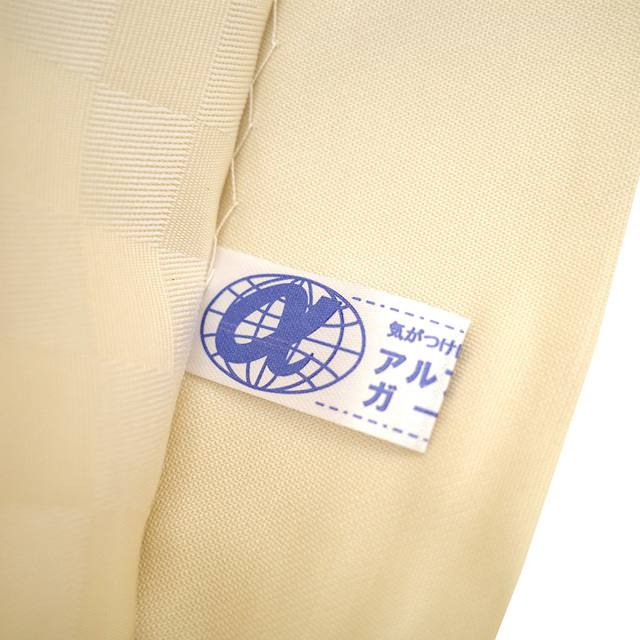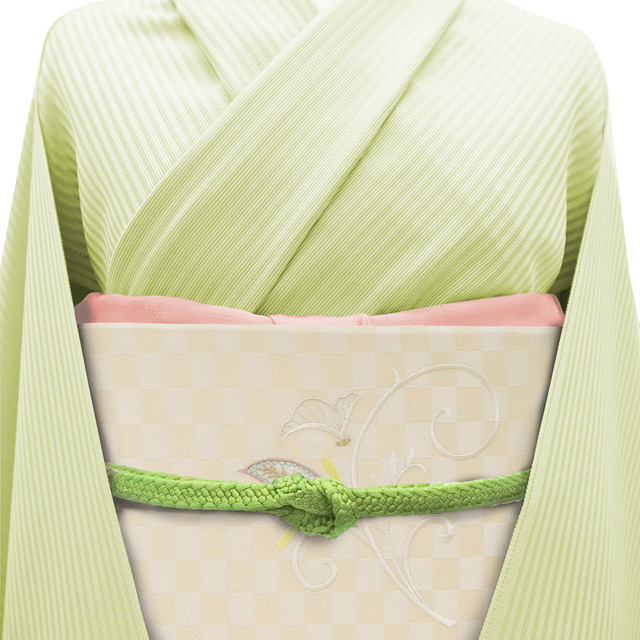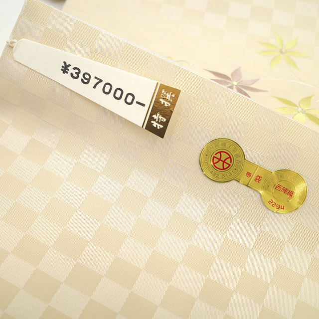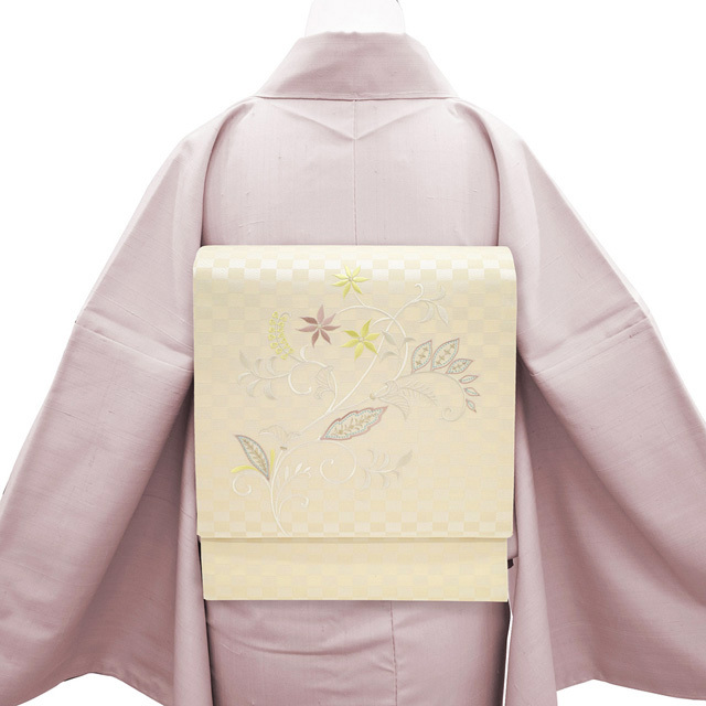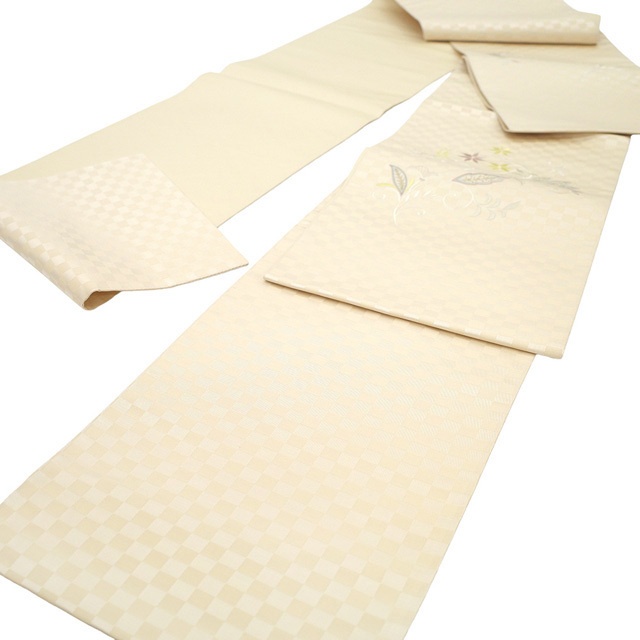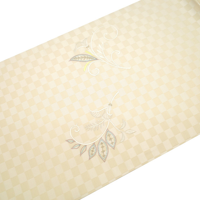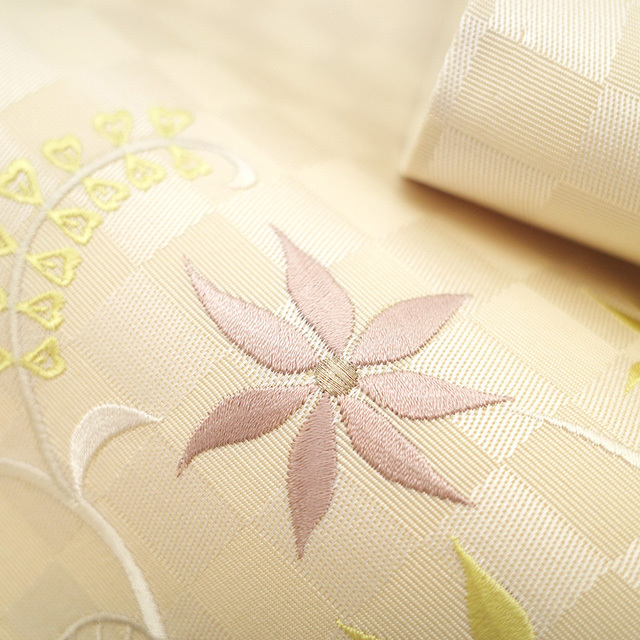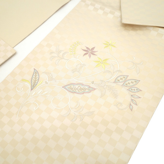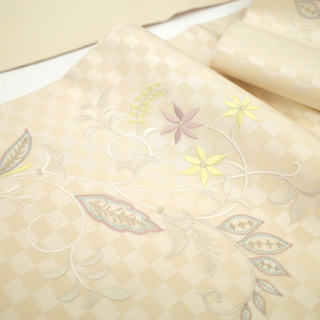 やさしいミルクティーベージュの地に、市松文様が織り出された上品な一品。そこに、エレガントな花唐草の刺繍が美しく映え、しっとりとした華やかさを添えています。洗練された雰囲気の中に、さりげない格と女性らしさを感じさせる、品の良いデザインです。