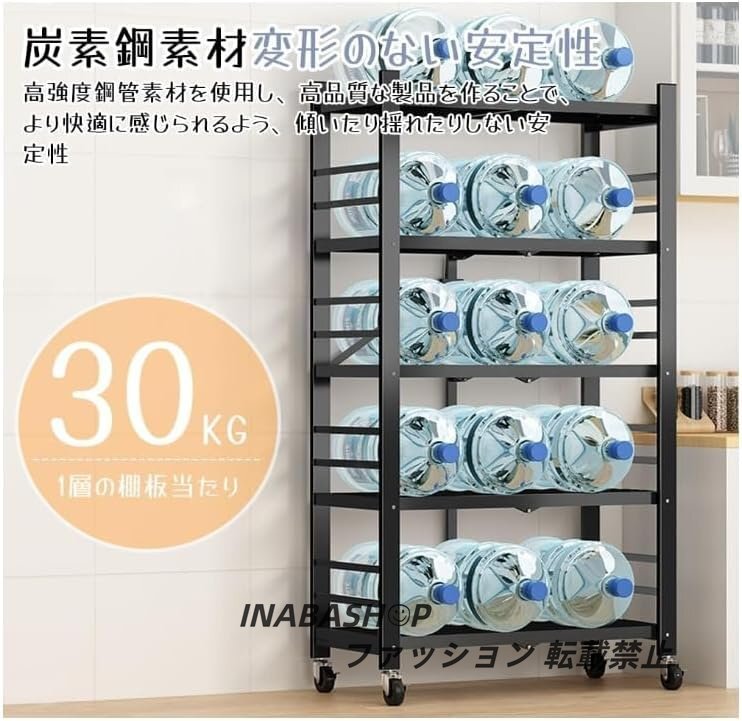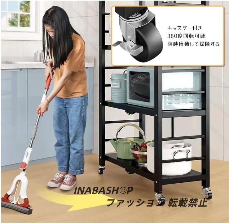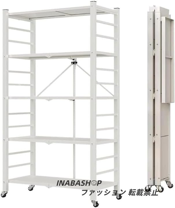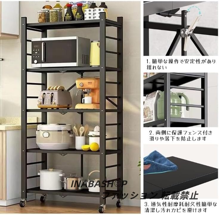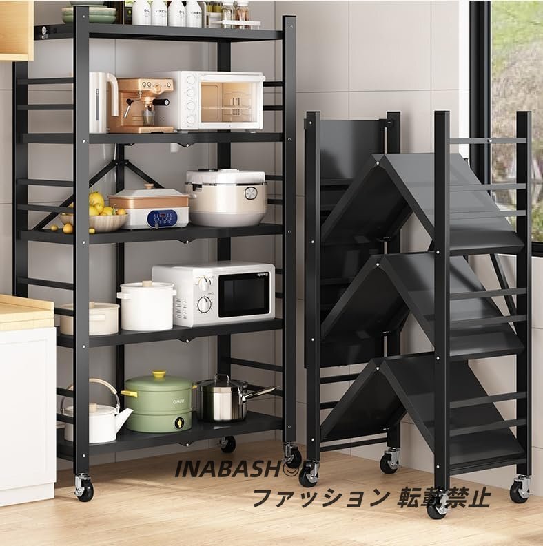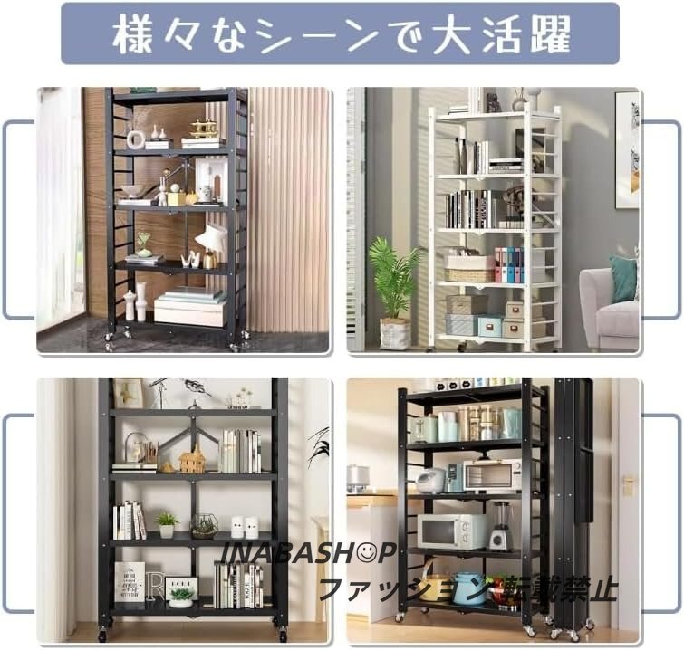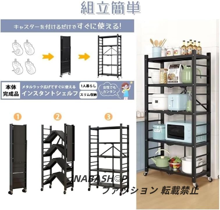 折り畳み式ラック 5段ブラック 折り畳み式収納 収納ラック 収納棚 オープンラック キッチンラック 360°回転キャスター付き