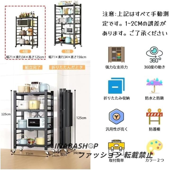 【組み立て簡単】面倒な組み立て不要、開くだけで使用可能、一人でも簡単な操作できて、まずキャスターを取り付けて、ラックの左右に広げてロックをかかれば組み立て完了です。【マルチ用途】折り畳み式、材質:炭素鋼材質、耐久性、錆びにくい、サイズ:71*34*156cm、360°回転式キャスターと両側に保護フェンス付き、物を置いたままの移動でも簡単、そして横から落ちることを防ぐ。シンプルな外観デザインで、家居、リビングルーム、書斎、店舗、オフィス、風呂室、キッチン、など様々なお部屋で活躍します。