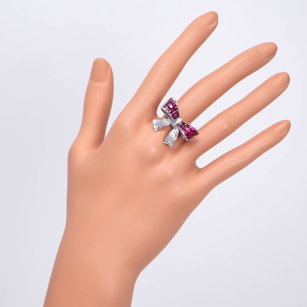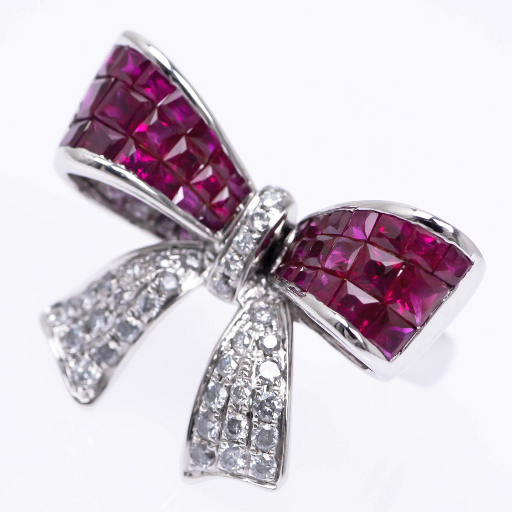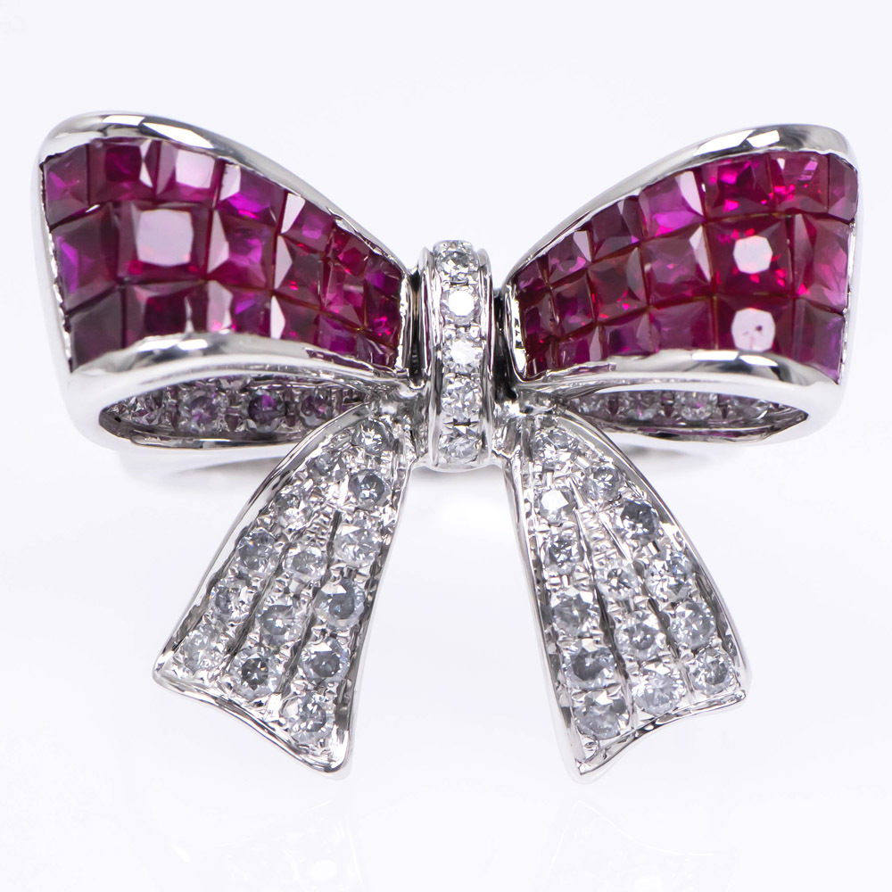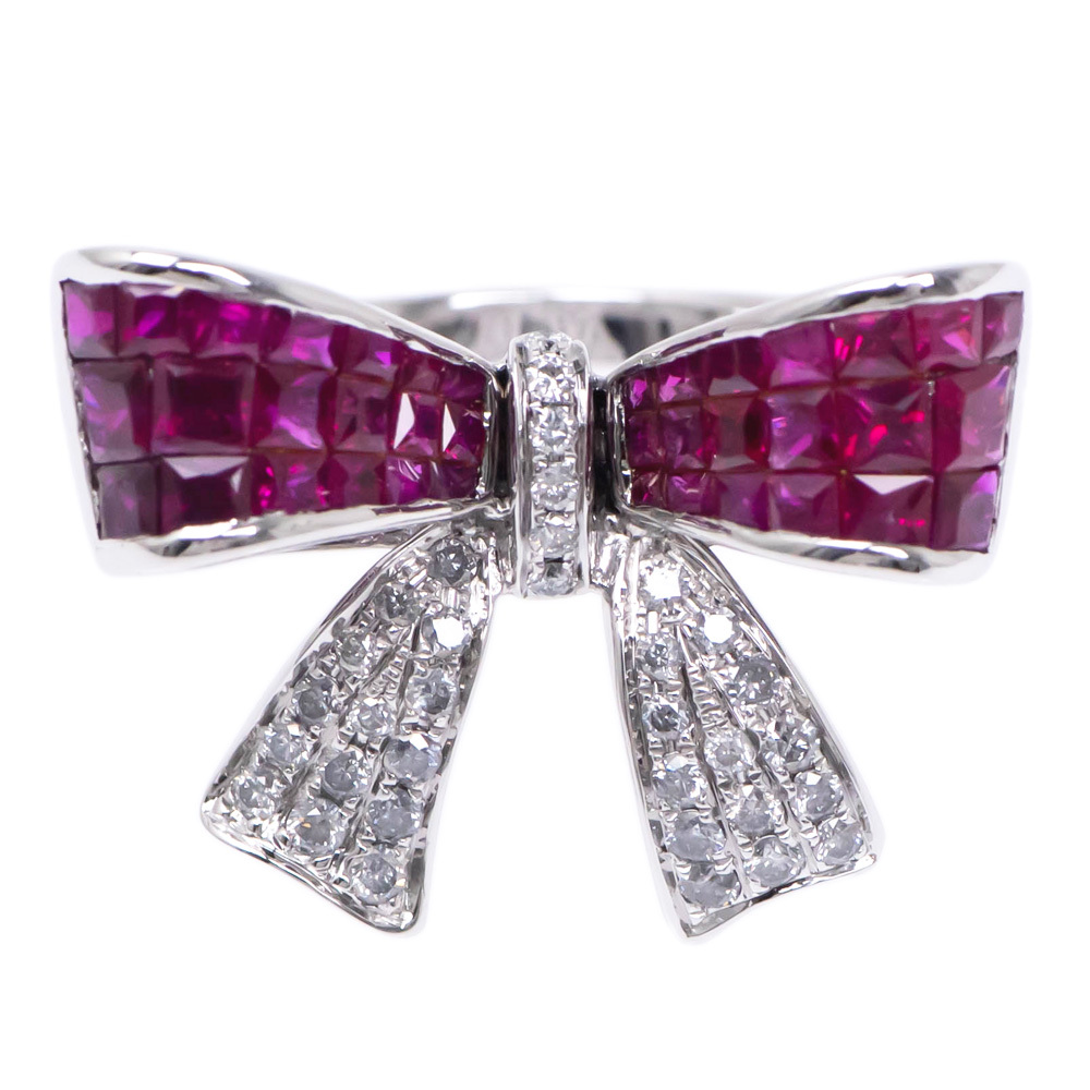 ミステリーセッティングのルビーが敷き詰められたリボンの内側にも、ダイヤモンドが敷き詰められており、作者のこだわりが感じられるデザインでございます。