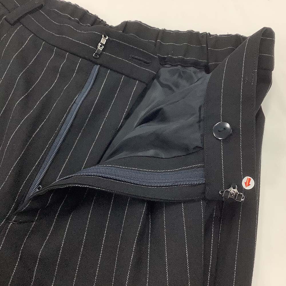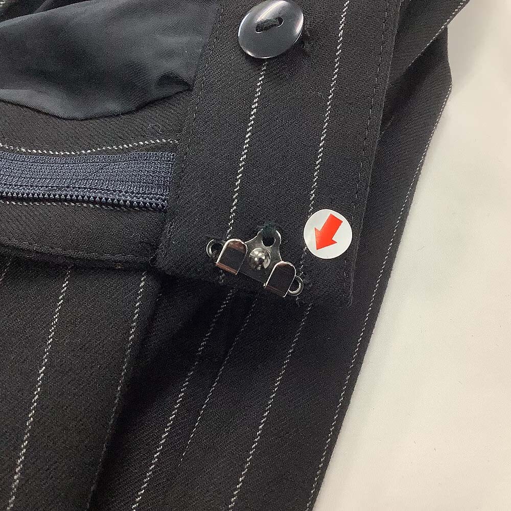 ウエストホックが一部外れています。全体的にスレ、毛羽立ち、引っ掛け傷があります。目立つ汚れはありません。