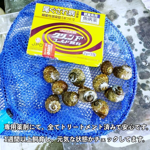 病気を持ち込むと、先住魚の隔離や薬浴、多量の水替えなど手間も時間もお金も余計にかかるので、トリートメント済みシッタカのお迎えをおすすめしています。こちらの商品は全て出品者で薬浴トリートメント済みですので、落札者様でして頂く必要はありません。到着しましたらすぐに水槽に入れることが出来て楽チンです。