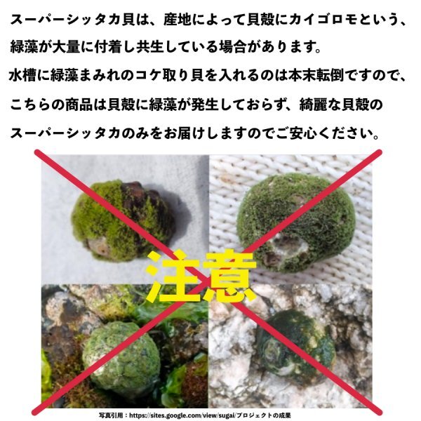 お迎えしたコケ取り貝にコケや藻がついているのは本末転倒ですので、貝殻に緑藻が生えていないスーパーシッタカのみ厳選して販売しています。