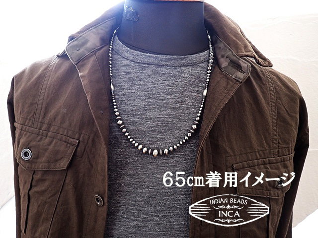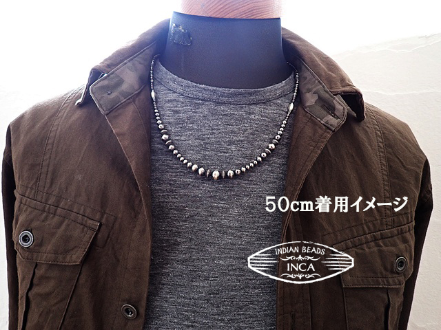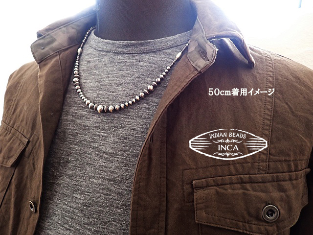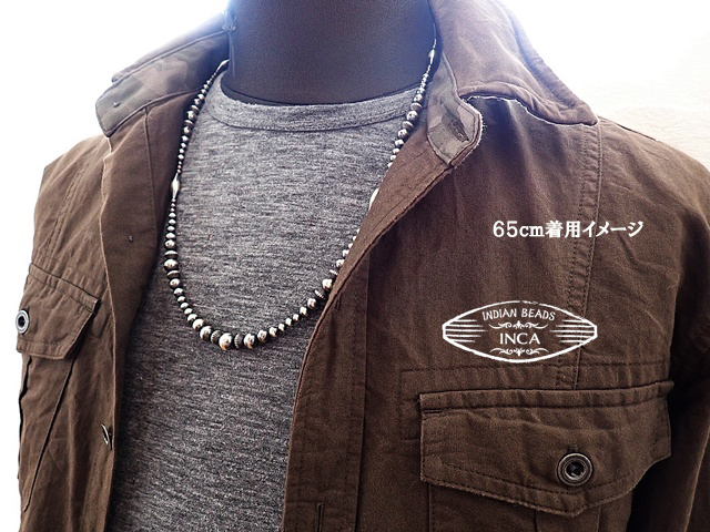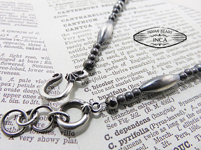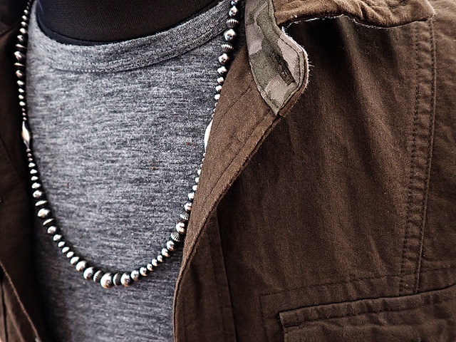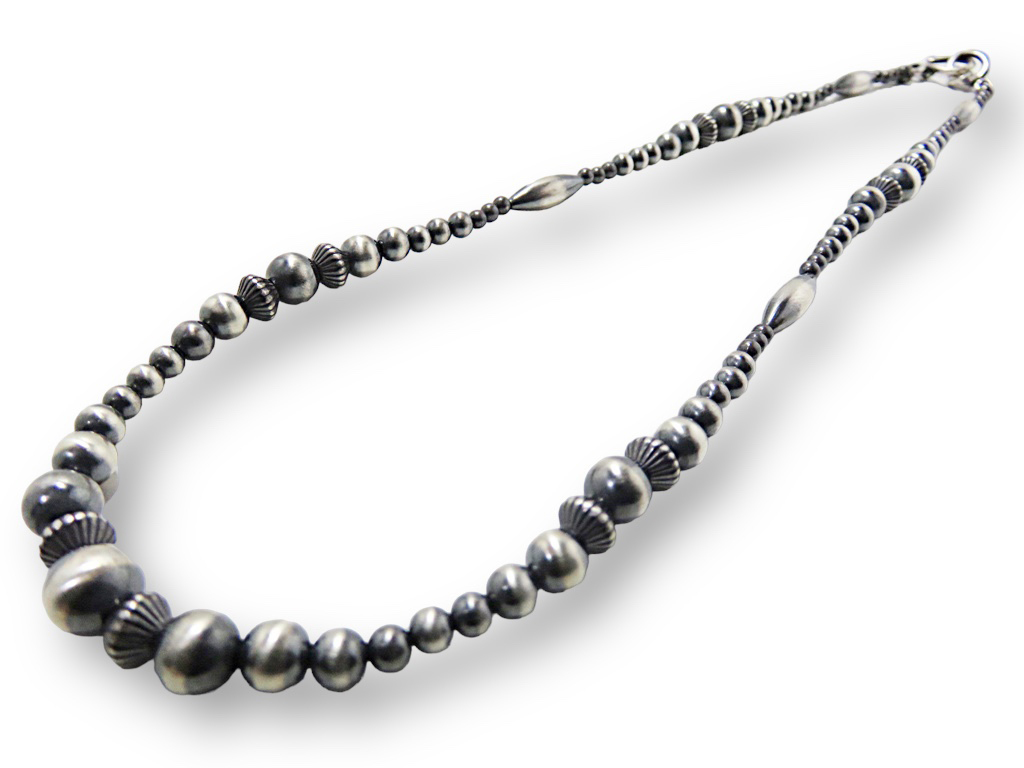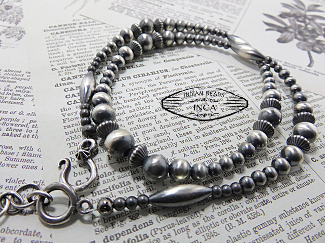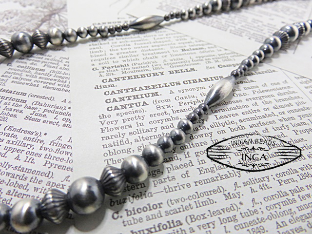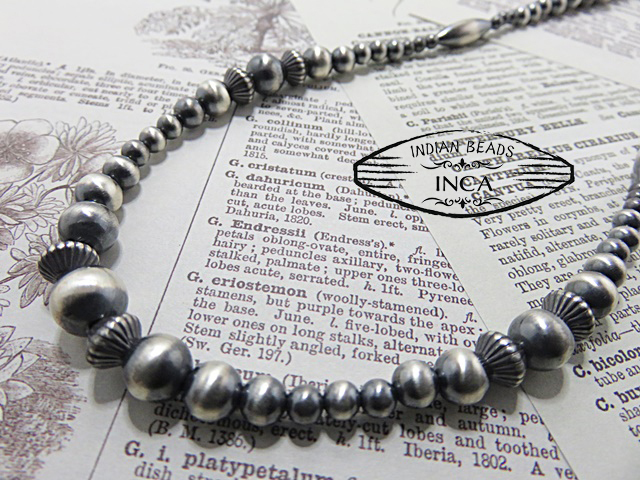 シンプルにシルバービーズのみでまとめたデザイナながら、やや大きめのナバホパールを各所に散りばめた重厚感漂う仕上がりになっております。ナバホパールとはアメリカ先住民のナバホ族から始まり表面はシルバー本来の輝きがあり、その両端に陰影を残すその仕上がりが真珠のように美しいことから現代では”ナバホパール”と呼ばれています。