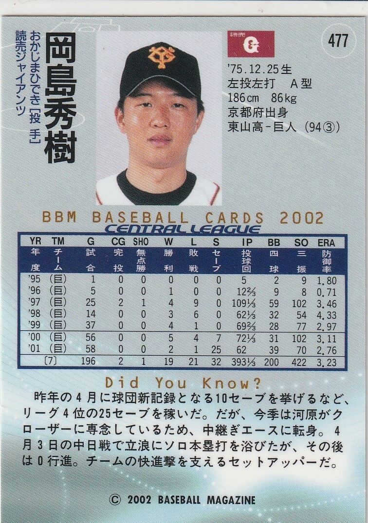 ●2002BBM/2nd 【岡島 秀樹】シルバーサインパラレル No.477:巨人 R4