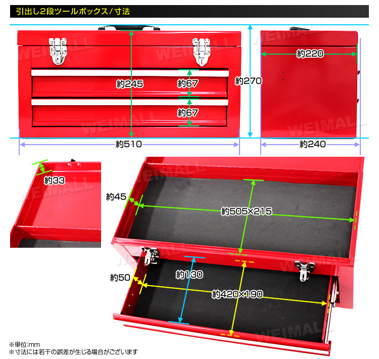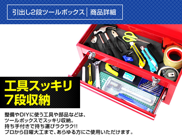 丈夫なスチール製!! プロからDIY用途まで幅広くご使用いただける、2段式のツールボックスです。 上段はよく使う工具入れに、引き出し部分に小物を収納するなど、整理・収納性がバツグンです。 引出しはベアリングを採用の為、開閉がスムーズです。 持ち手付きで、持ち運びに便利なので、車載工具入れや屋内作業用の工具入れとしても使用可能です。 ●仕様 本体サイズ(約):W510×D240×H270mm トップトレーサイズ(約):W505×D215×H45mm 引出サイズ(約):W420×D190×H50mm 重量(約):8kg 素材:スチール 色:レッド ●注意事項 ・入荷時期により予告無くデザインや色やサイズなど、細かな仕様が変更される場合がございます。 ・輸入品につき傷やスレなどがある場合がございます。ご了承下さい。 |