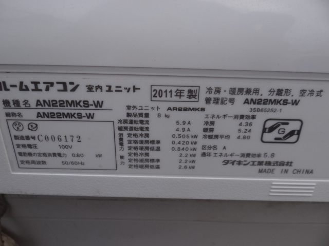 | ダイキン ルームエアコン AN22MKS-W / AR22MKS 6畳 100V 2011年製 |