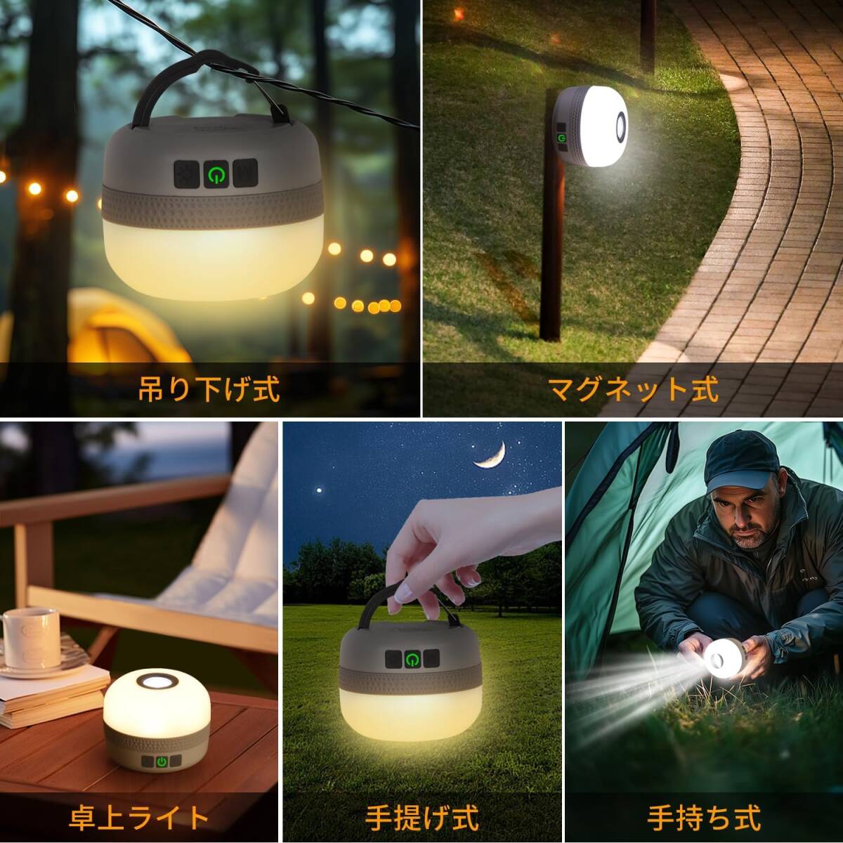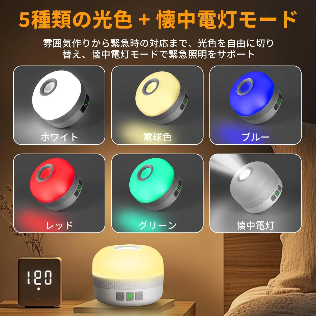 【5種類の光色、無段階調光】このLEDランタンは、ホワイト、電球色、ブルー、レッド、グリーンの5種類の光色を提供し、シーンやニーズに応じて自由に切り替え可能です。例えば、書斎、寝室、キャンプサイト、夜釣りなどに最適です。ランタンモード(5種類の光色)と懐中電灯モード(1種類の光色)では、「明るさ」ボタンを長押しすることで、1%から100%までの無段階調光が可能で、柔らかな光から強力な遠距離照明まで対応します。【ご注意】撮影時の光の具合やディスプレイ設定などにより、ランプの光色が実際の色と多少異なる場合があります。