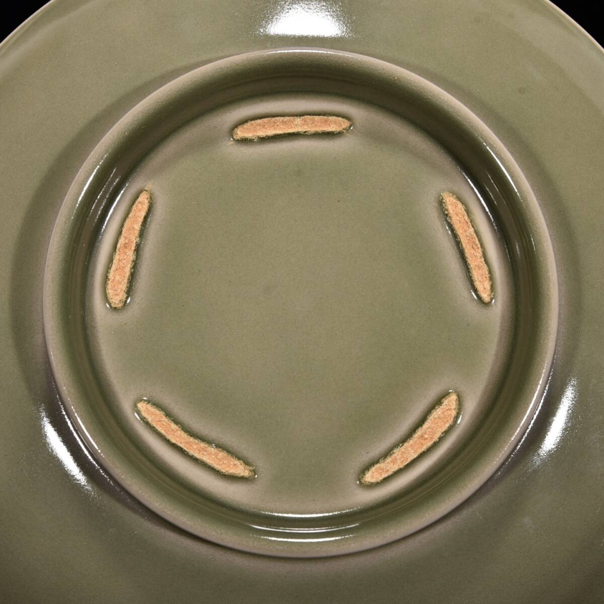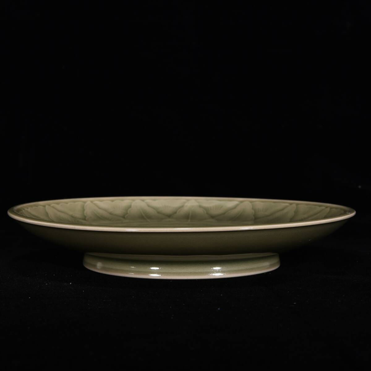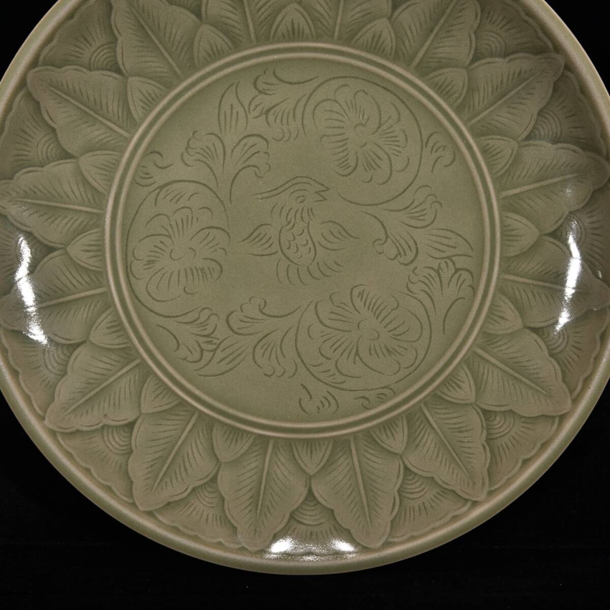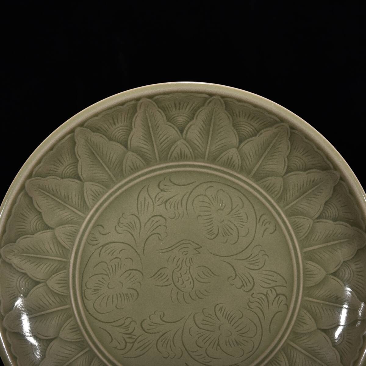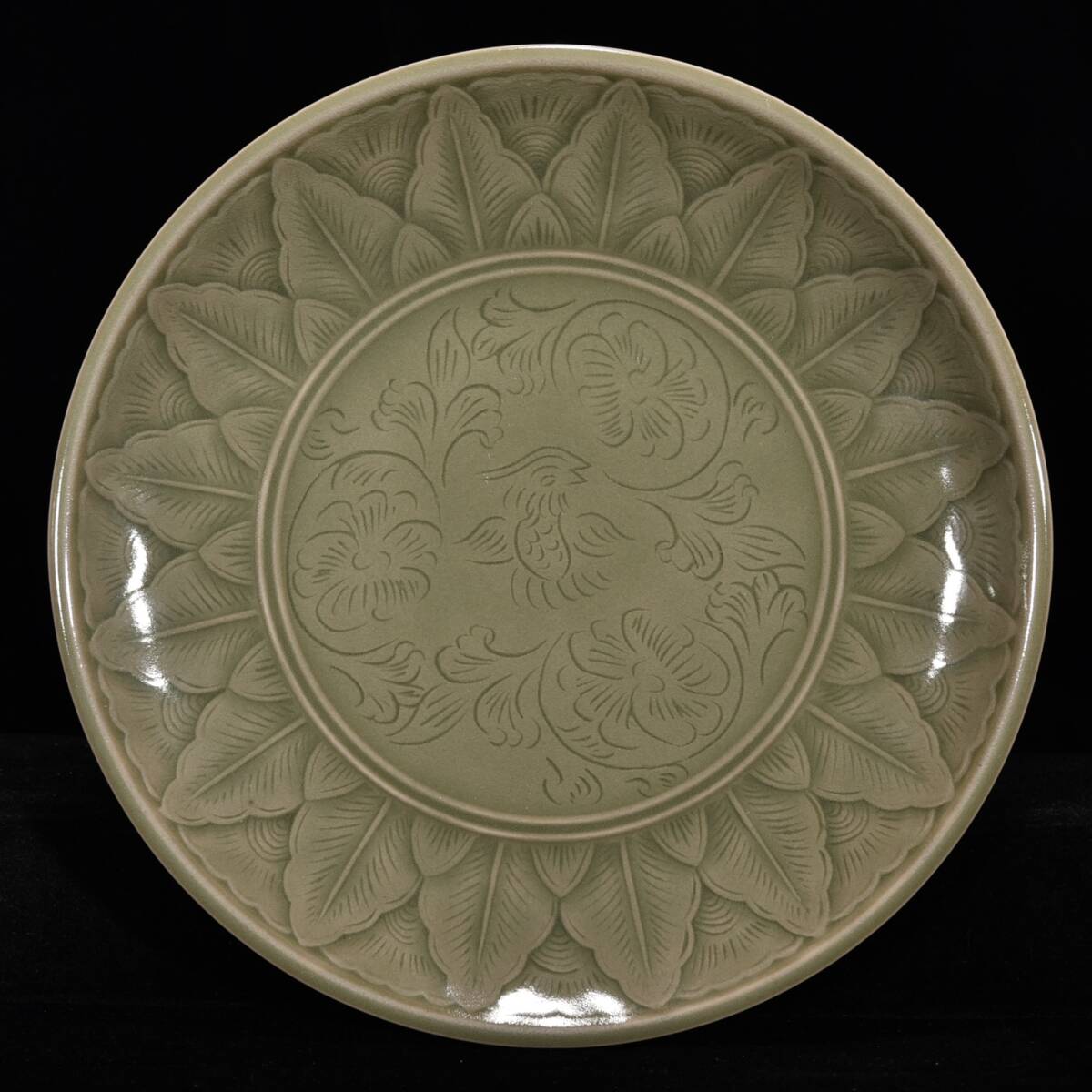 人間国宝209269 中国骨董 磁器【岳窯秘色彫鳳凰文フルーツ皿】工芸品 施釉陶 青花磁 陶芸 本物 古美術 旧蔵 珍品