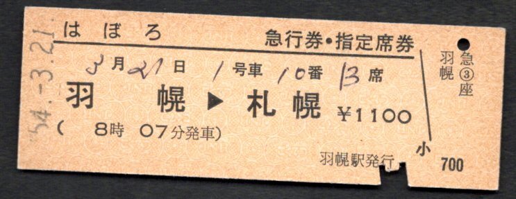 はぼろ急行券・指定席券(羽幌駅)完全常備券