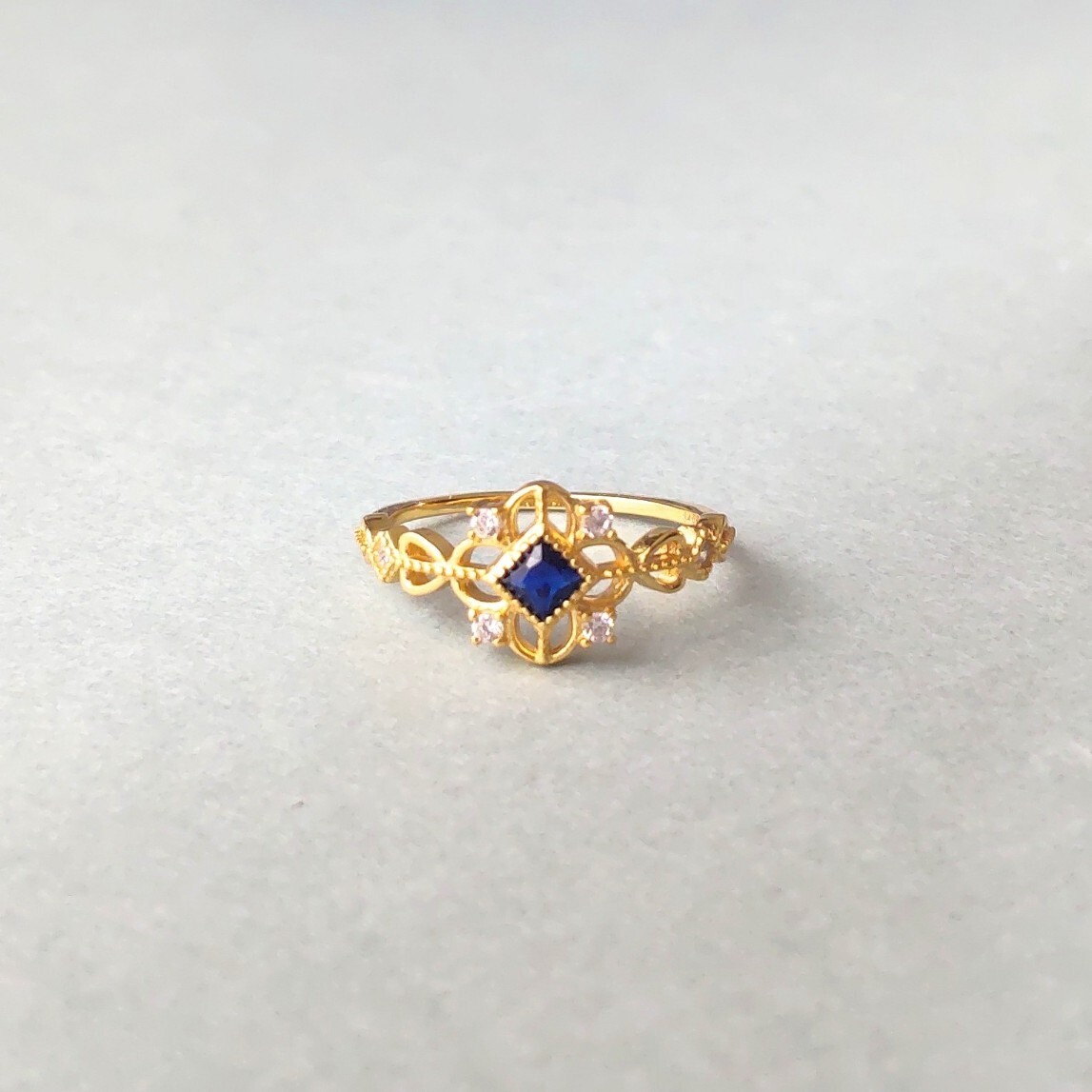 中心には深いブルーのジルコニアが一粒、まるで夜空に輝く星のように配置され、その周りを取り囲む小さなキュービックジルコニアが、花びらのように繊細で美しい光を放ちます。
