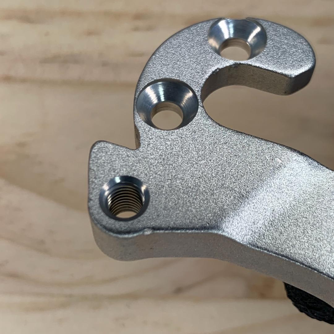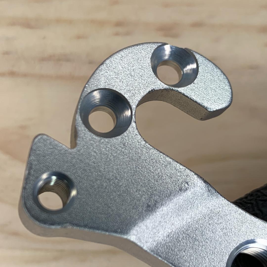 自転車のフレームを保護するための重要部品、アルミ合金製ディレイラーハンガーです。転倒や衝撃時にこの部品が身代わりとなって折れることで、高価なフレームを守る役割を果たします。