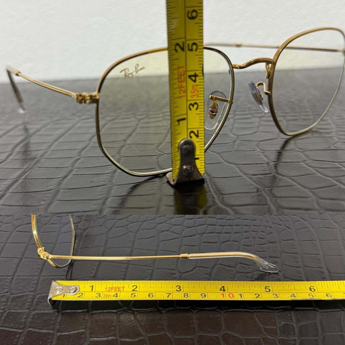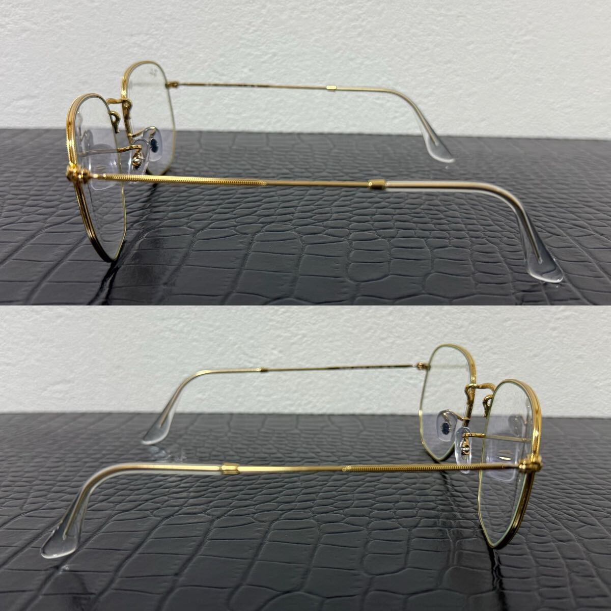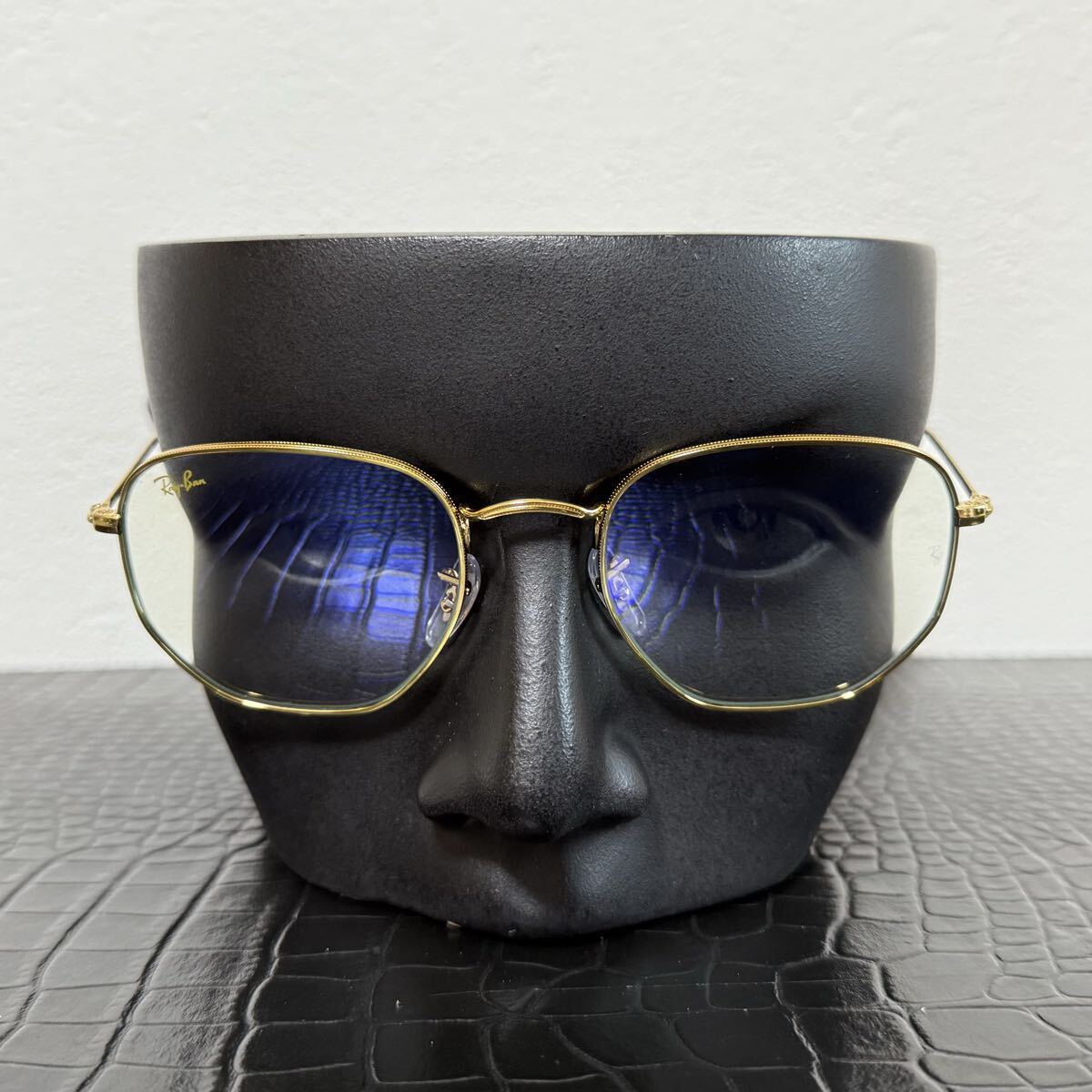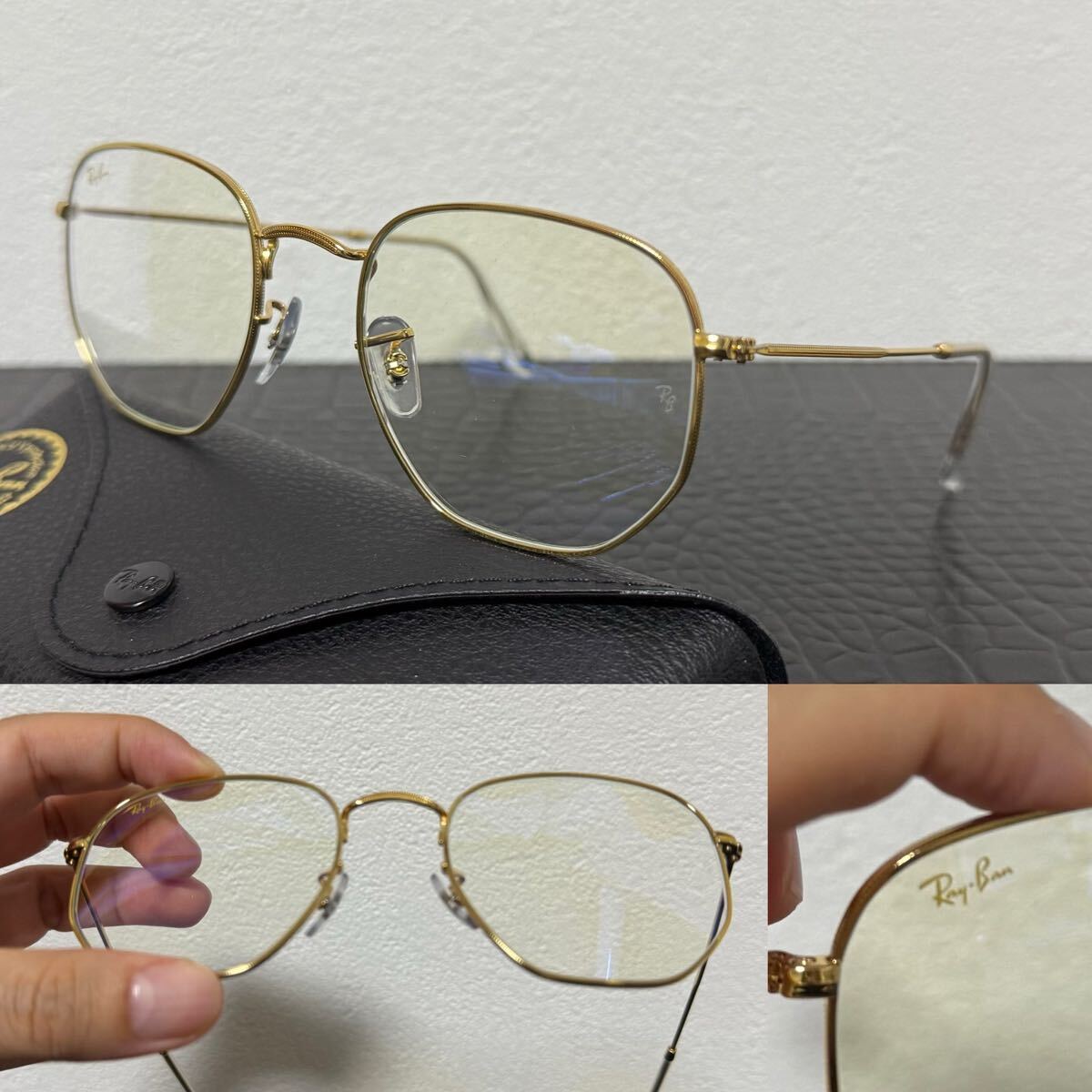 細身ゴールドフレームにクリア色のブルーライトフィルターレンズの組合せは上品でお洒落です。右レンズのレイバンのロゴも映えておりインスタ映えも抜群です!