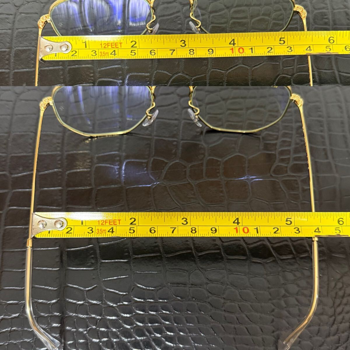 写真での採寸のとおり、横幅は前部分が約13.6センチです。後ろ部分が約13.5センチです。お持ちのメガネのサイズがそれから1センチ前後のサイズ感であればおそらく着用いただけます。
