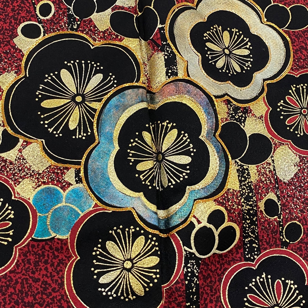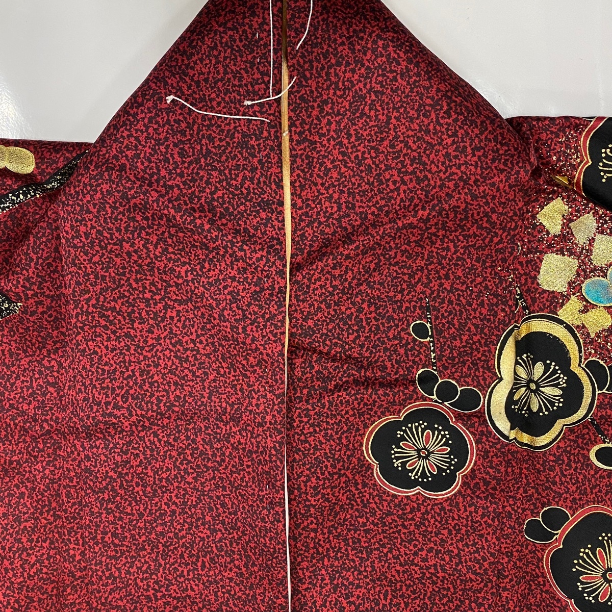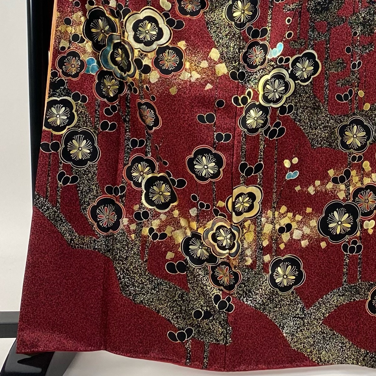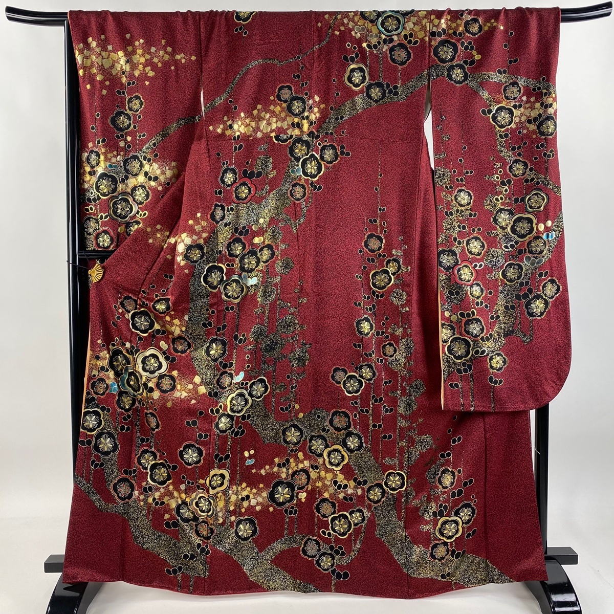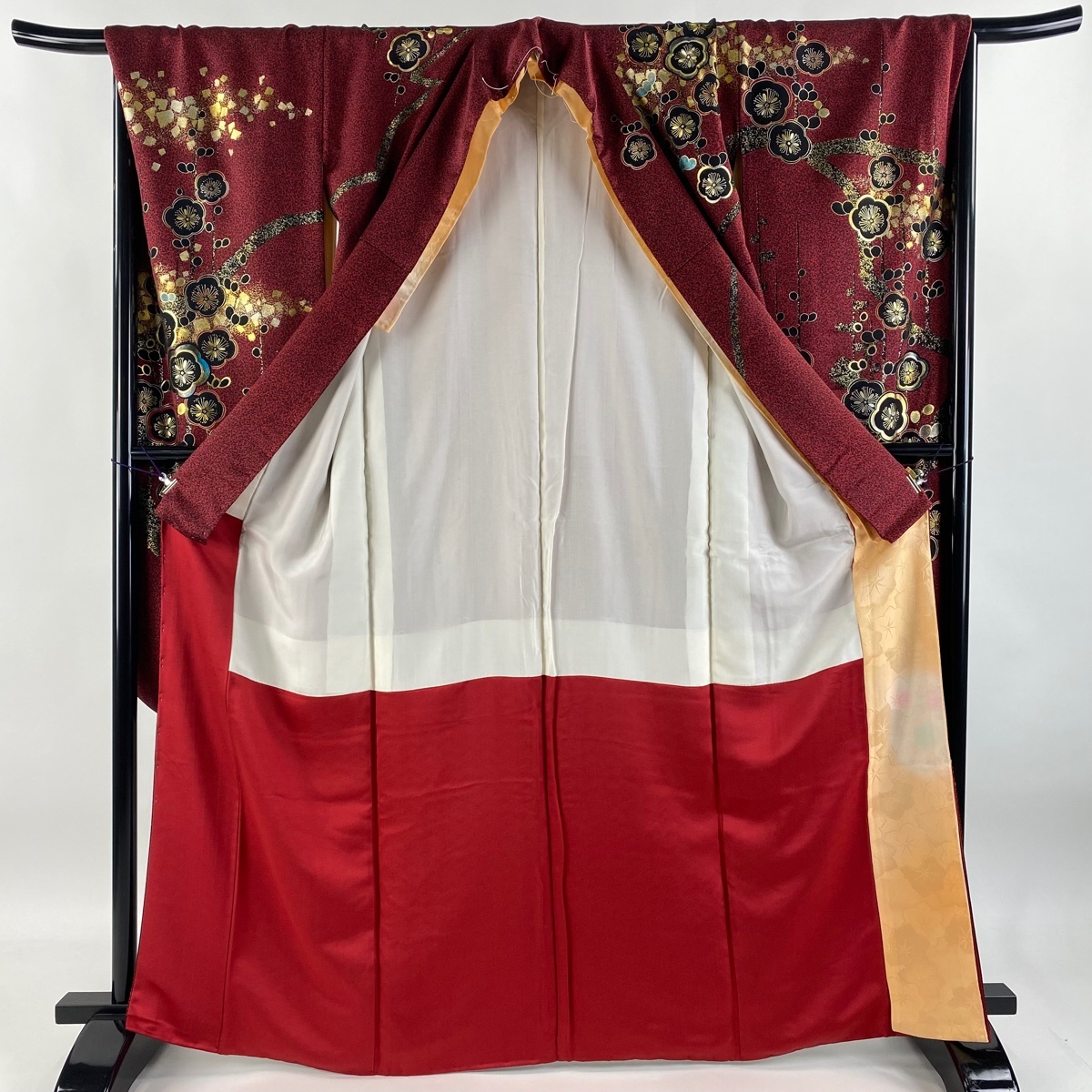 振袖 秀品 梅 箔散らし 金銀彩 金糸 えんじ色 袷 身丈165 裄丈69 L 正絹 【中古】 |