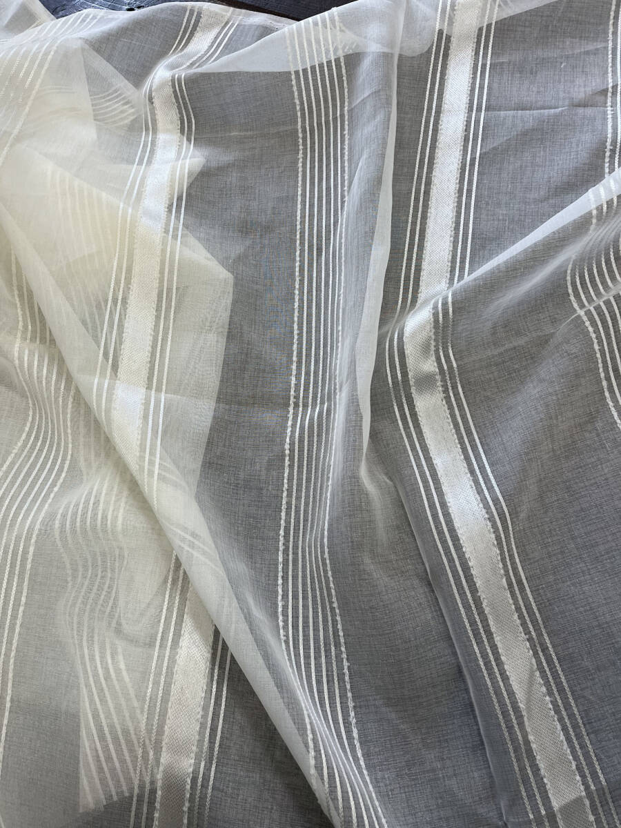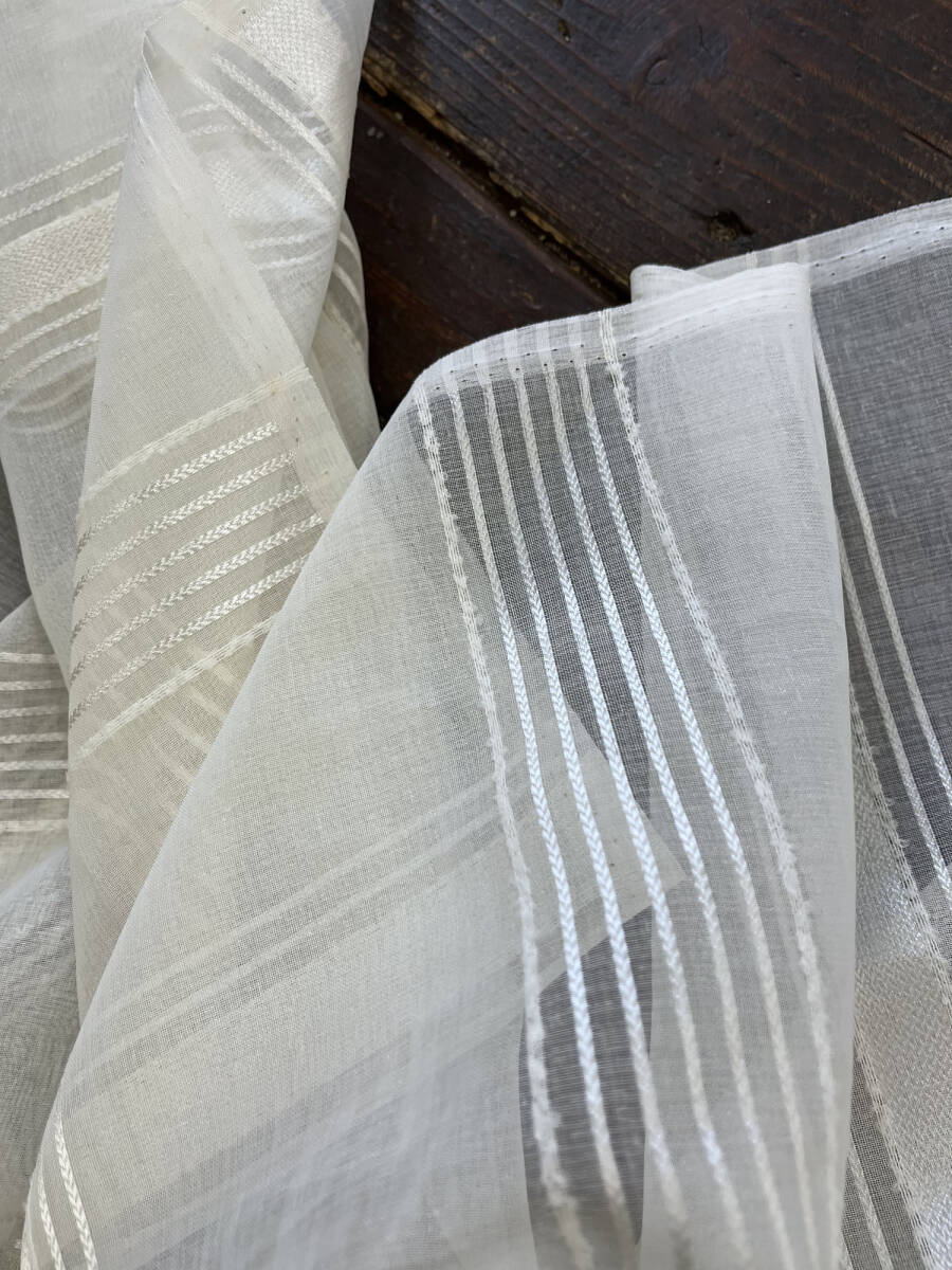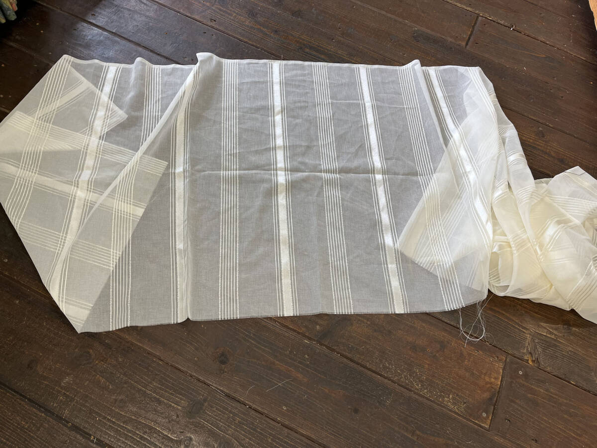 レースカーテン生地はぎれ 太さの違うストライプを配置したデザイン カフェカーテンなんかもおしゃれです 窓辺を素敵に飾れます 素材はポリエステル100% サイズは:巾400㎝×丈80㎝ 無地の生地と重ねてクッションカバー なんかもおしゃれです お化粧ポーチも可愛いです 色んなものがハンドメイドできます | |