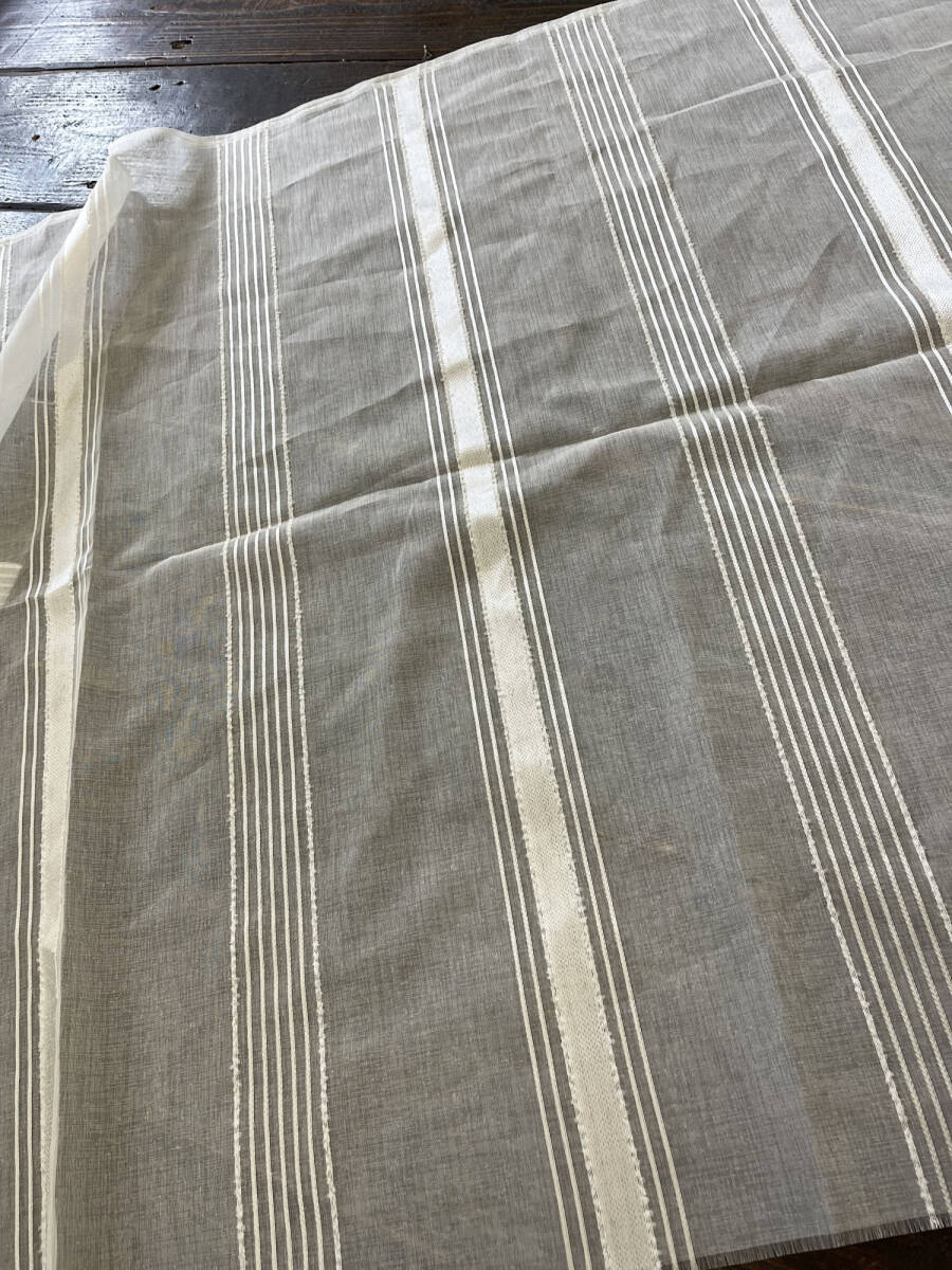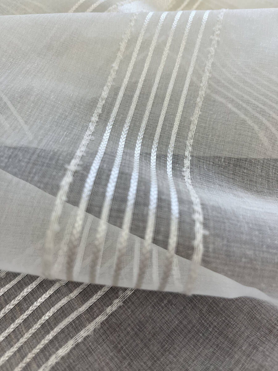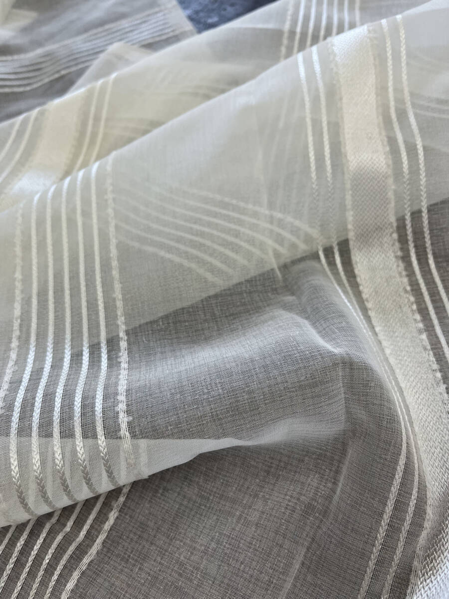 レースカーテン生地はぎれ 太さの違うストライプを配置したデザイン カフェカーテンなんかもおしゃれです 窓辺を素敵に飾れます 素材はポリエステル100% サイズは:巾400㎝×丈80㎝ 無地の生地と重ねてクッションカバー なんかもおしゃれです お化粧ポーチも可愛いです 色んなものがハンドメイドできます | |