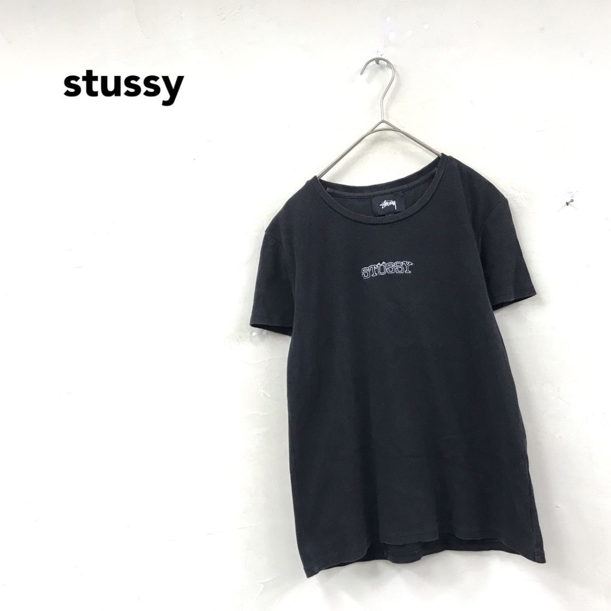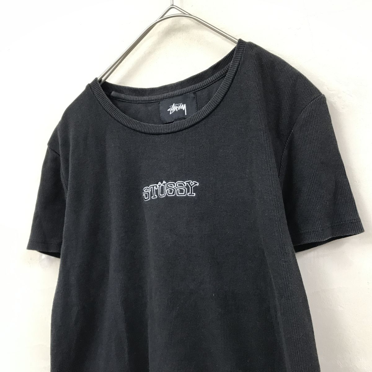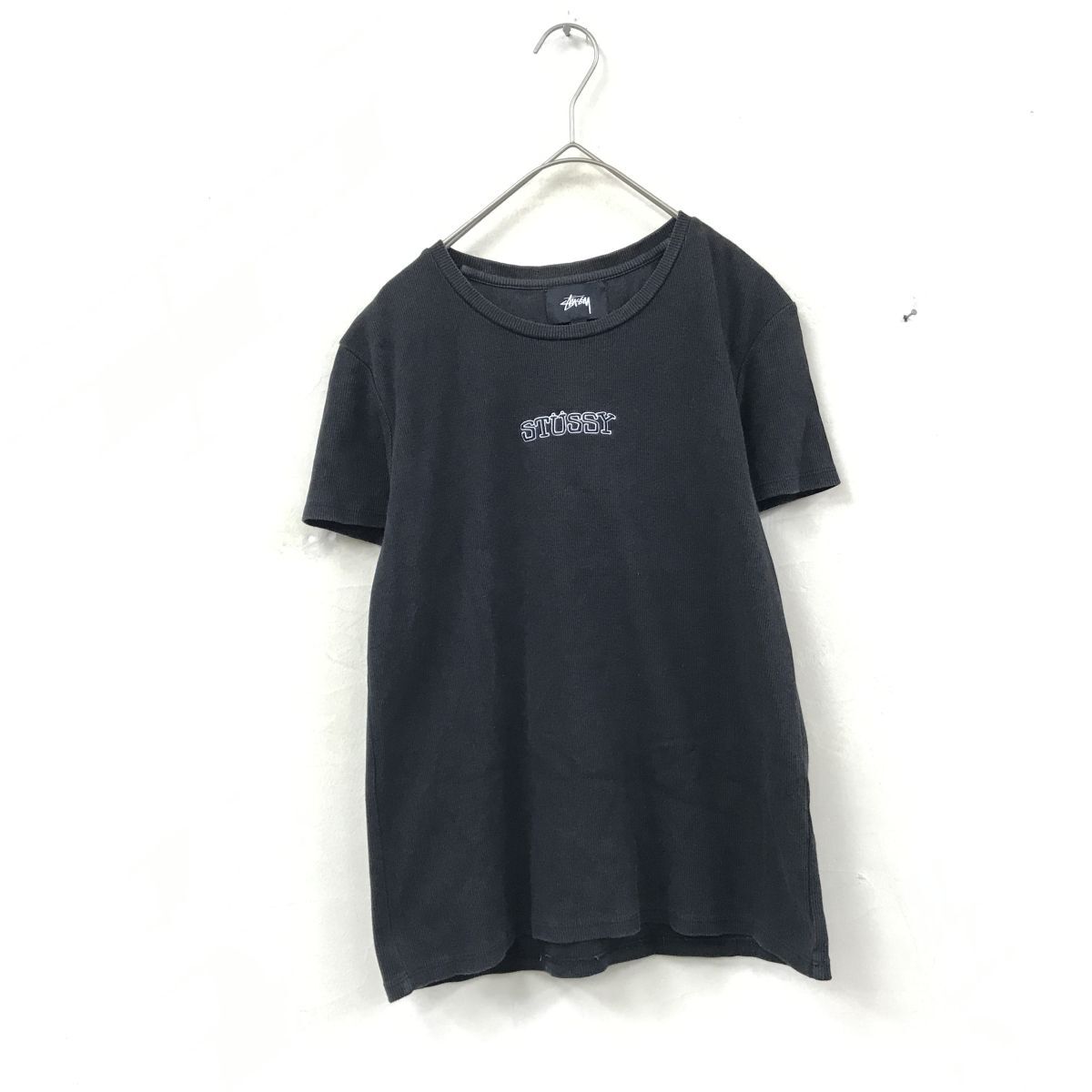 2K1833-D◆ stussy ステューシー 半袖Tシャツ カットソー リブニット ロゴ刺繍 ◆ sizeM ブラック コットン
