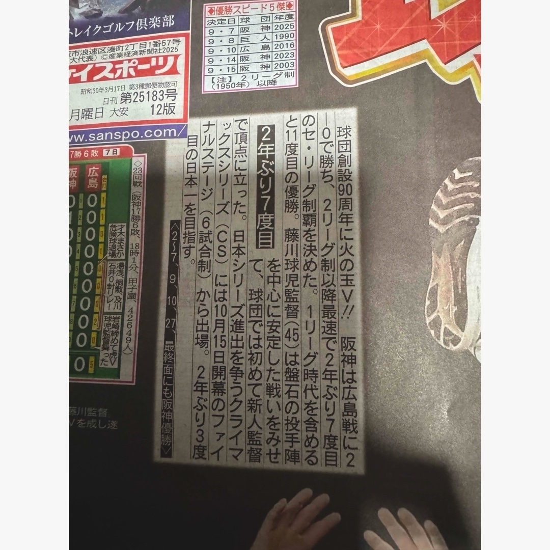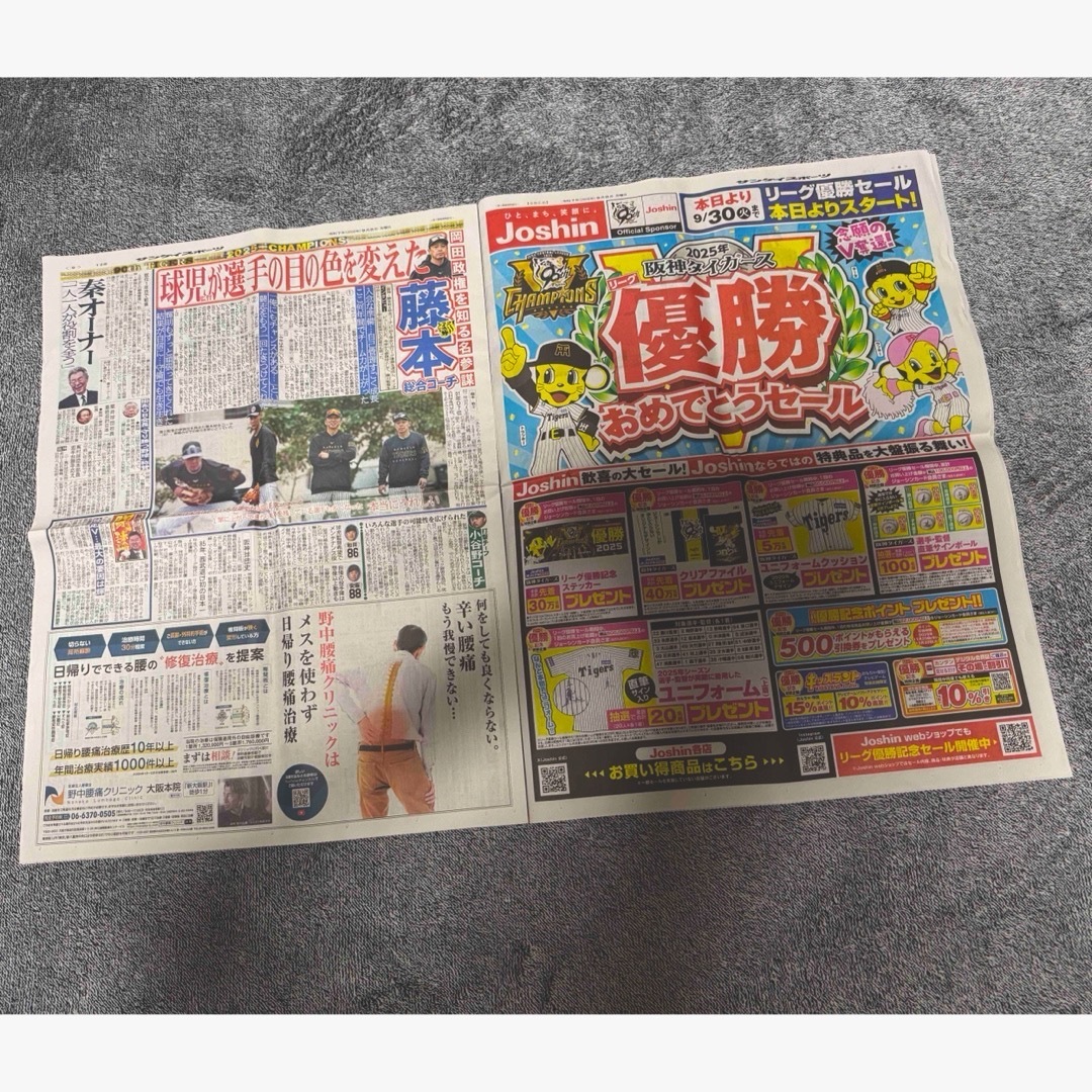 阪神タイガース優勝 2025年 9月 8日 サンケイスポーツ新聞 新品 ! 。