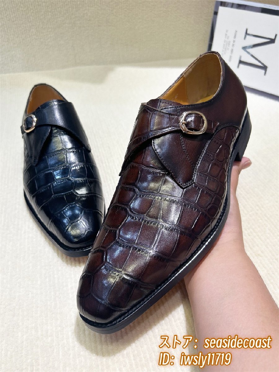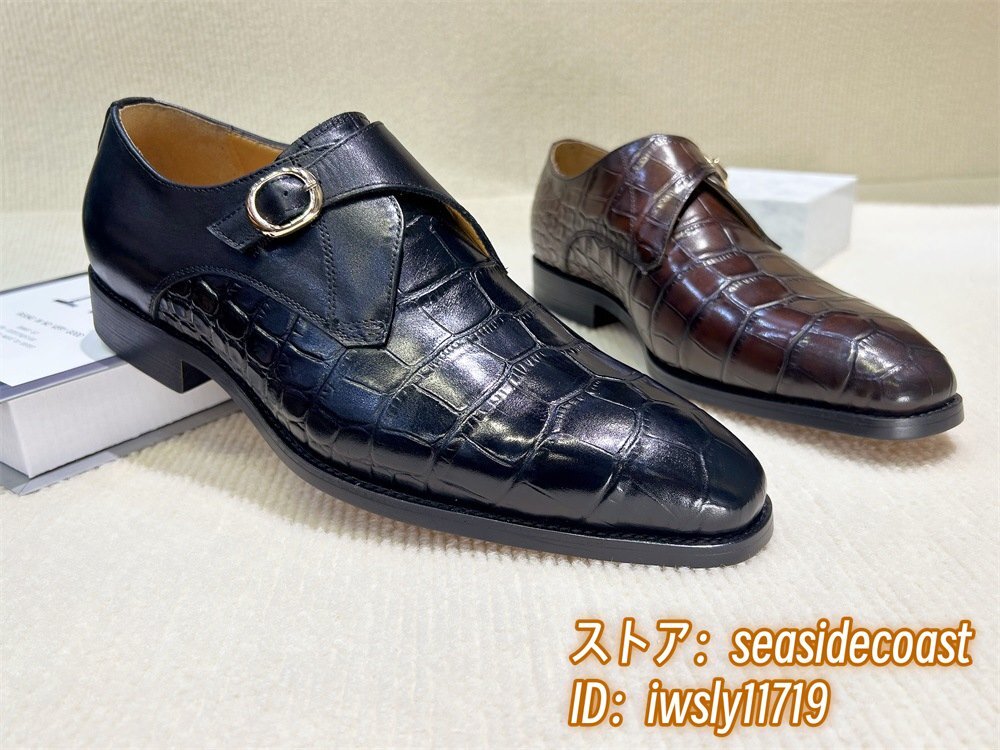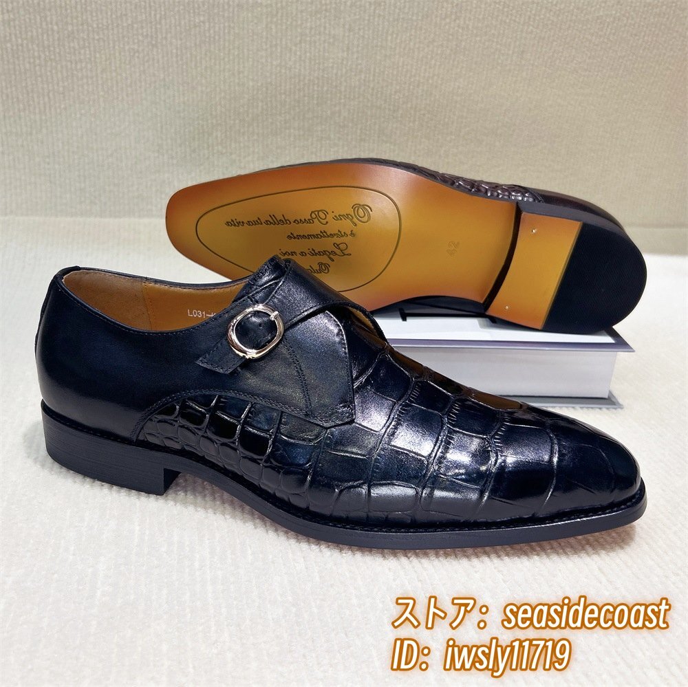 超希少★新品 ビジネスシューズ 本革 レザーシューズ 高級牛革 鰐柄 職人手作り モンクストラップ 紳士靴 革靴 フォーマル ブラック 27.5cm