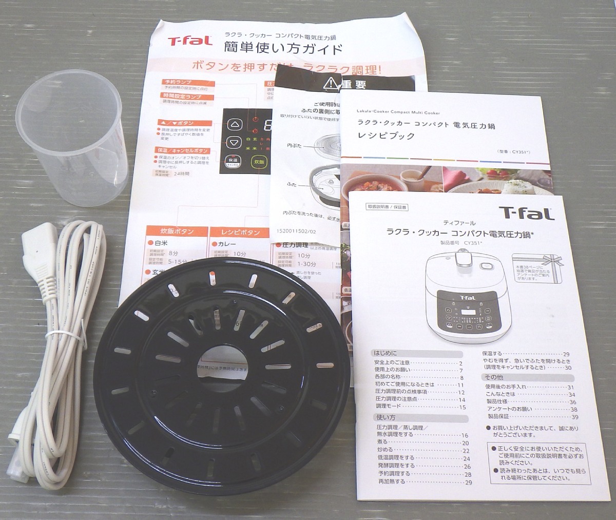 付属品:炊飯用カップ、蒸し台、簡単使い方ガイド、レシピブック、取扱説明書兼保証書