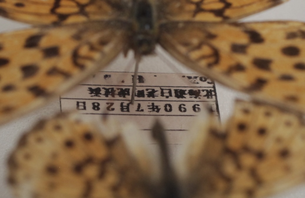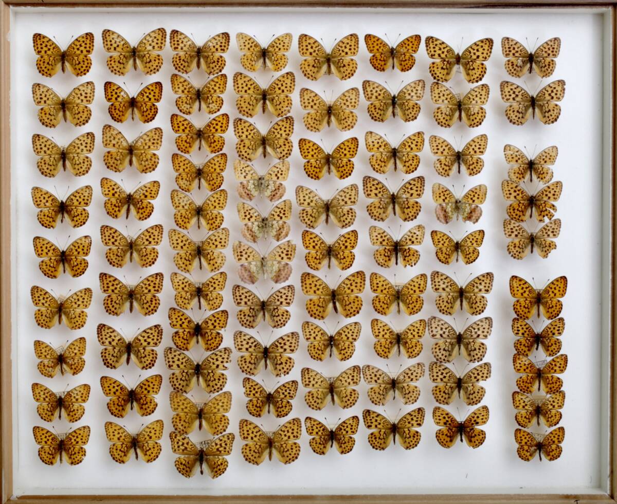 ヒョウモンチョウ本州中部亜種(B.ino tigroides)の展翅標本です。 右3頭 北海道亜種(B.ino mashuensis) ・右6頭コヒョウモン(Brenthis ino tigroides)