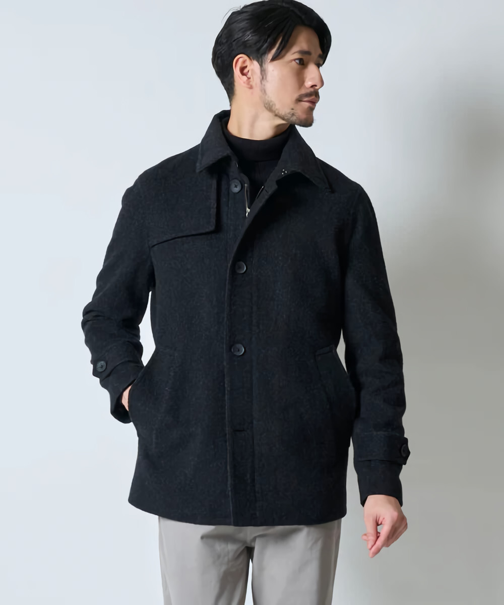 上質なウールにカシミヤをブレンドした、しなやかで暖かみのあるショートコート。バーズアイ織りによる繊細な表情が、スタイリングに奥行きを与え、シンプルながらも洗練された印象を演出します。