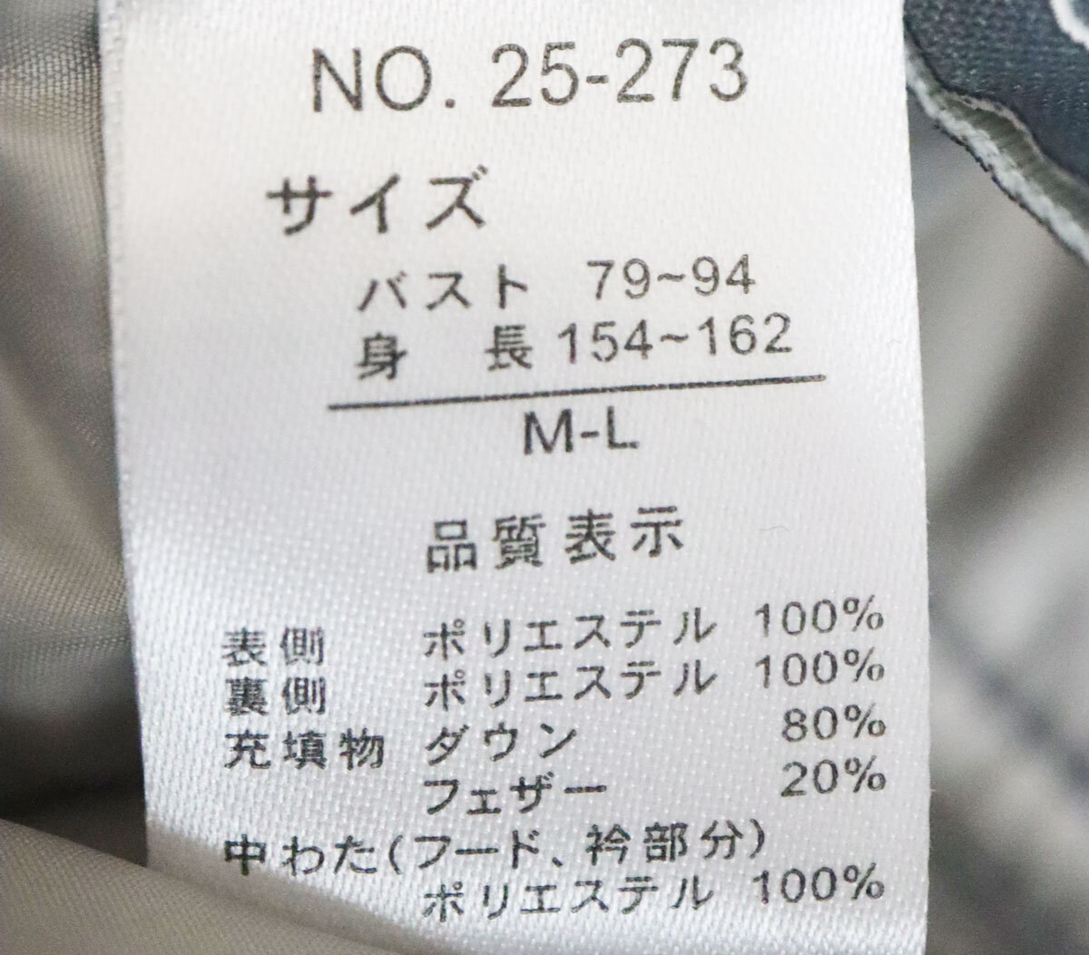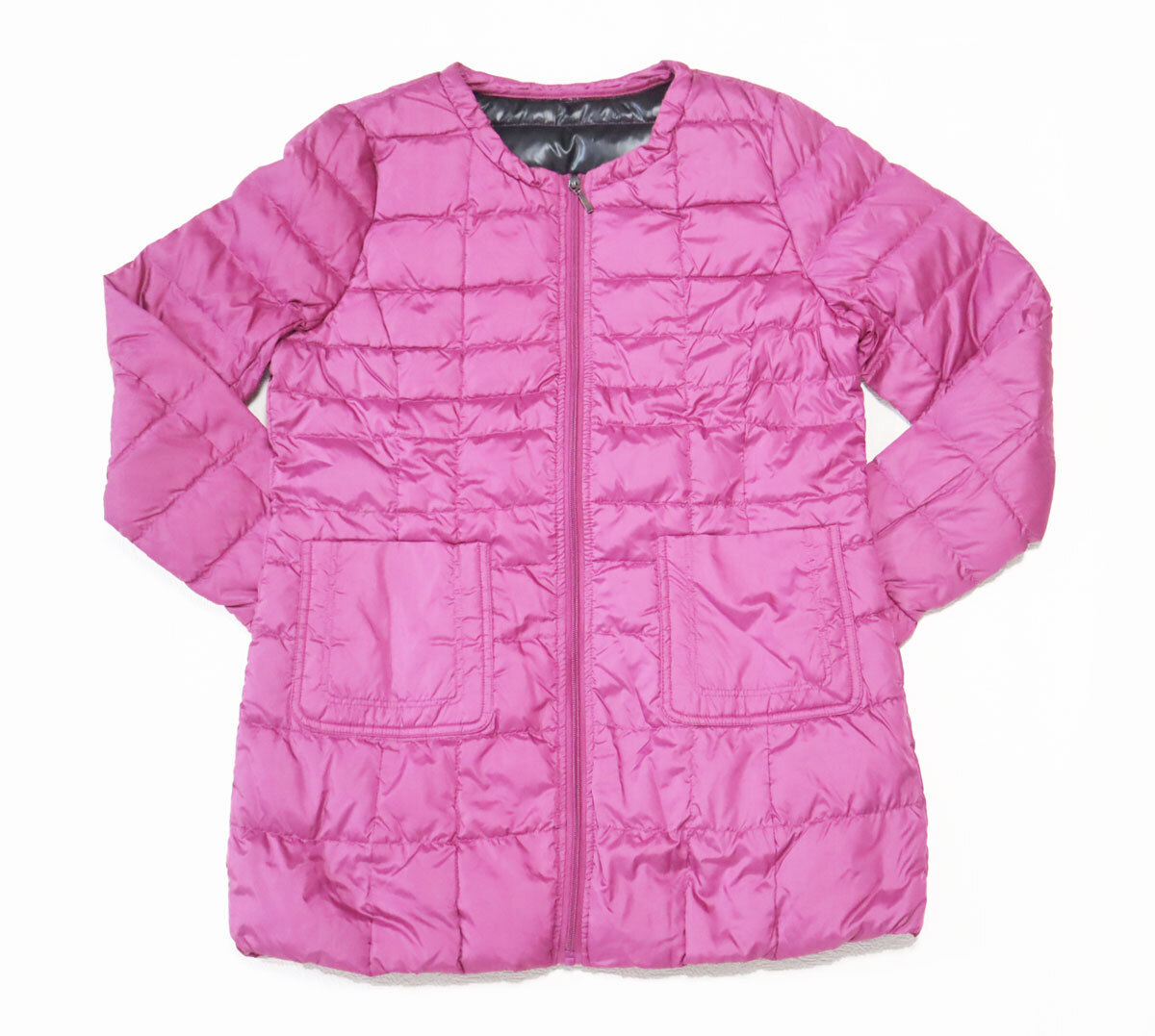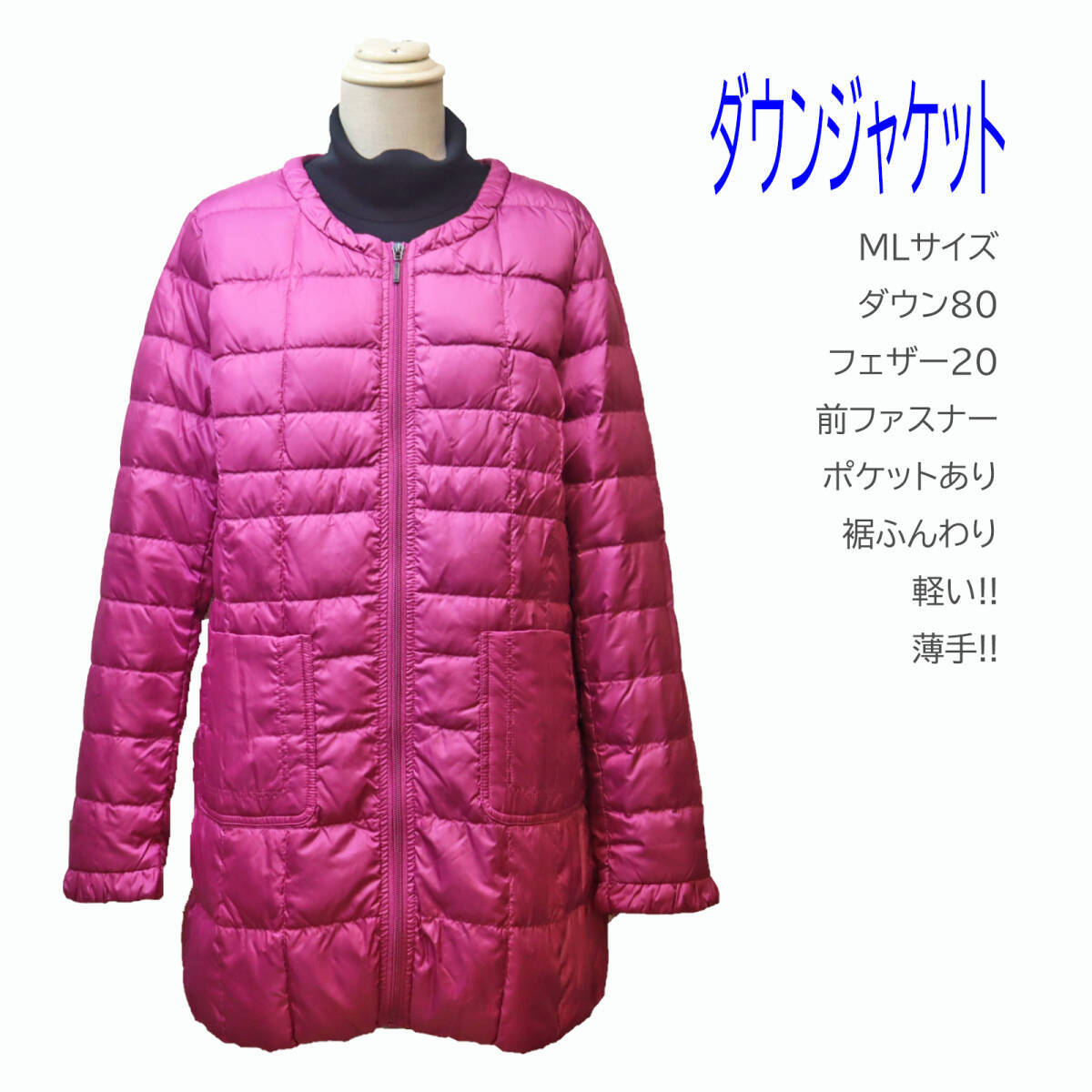 ダウンフェザーの軽いジャケット ダウンジャケット シンプルなデザイン 少し、裾がふんわりしています。 前は、ジッパー ポケットあり 軽いです。 ◆素材 :表地‥ポリエステル 中綿・・ダウン80 フェザー20 ◆表示サイズ:バスト79-87 身長154-162 ◆実寸:バスト100 裾周り106 着丈75 肩幅36 袖丈60