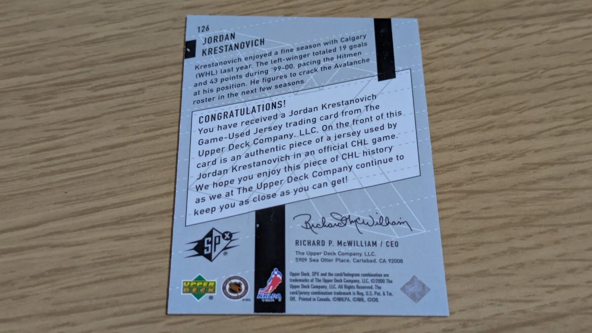 3、Jordan Krestanovichゲーム実使用ジャージ入りカード。