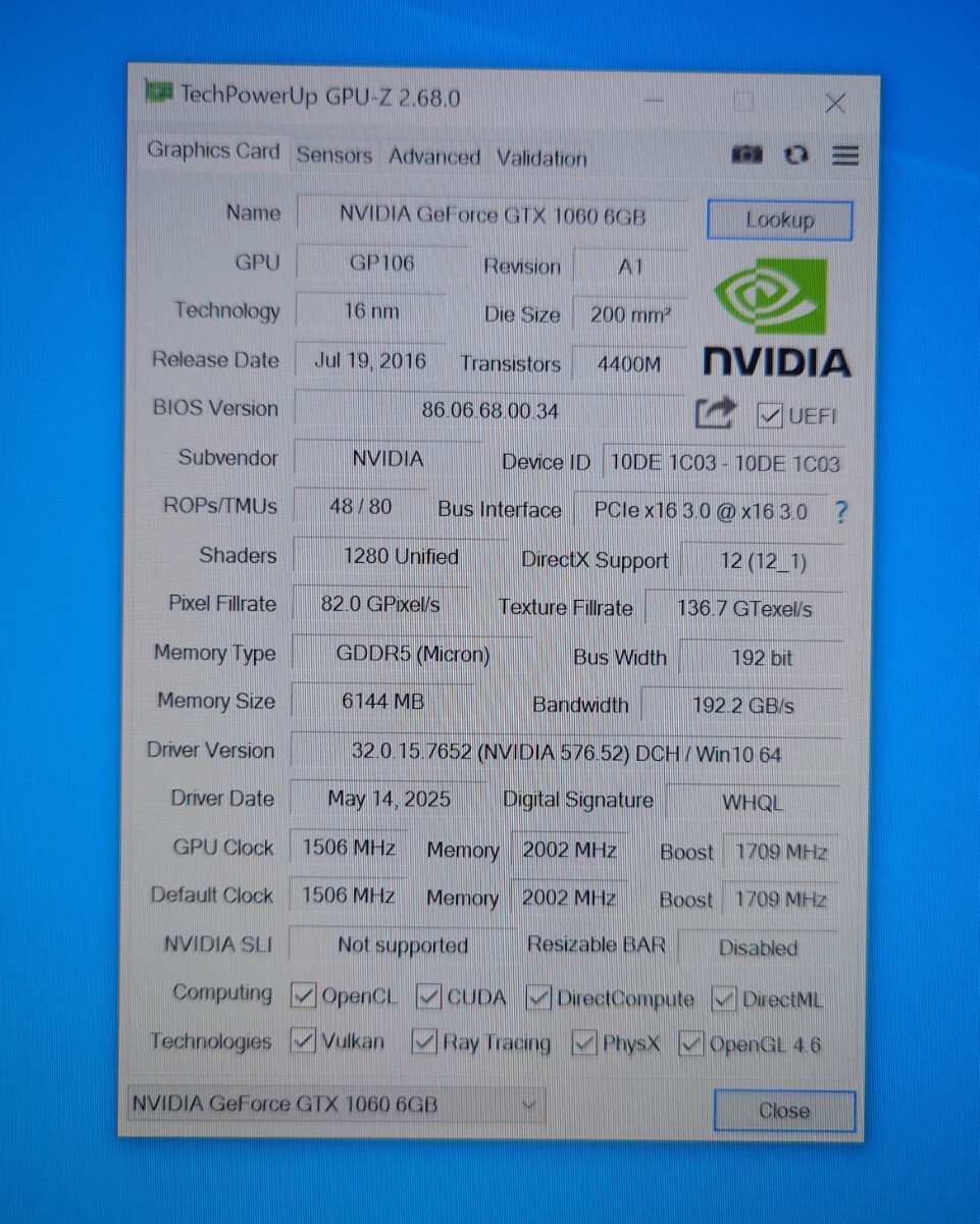 NVIDIA GEFORCE GTX1060 6Gグラフィックボードとなります。HDMIにて映像出力出来ました。