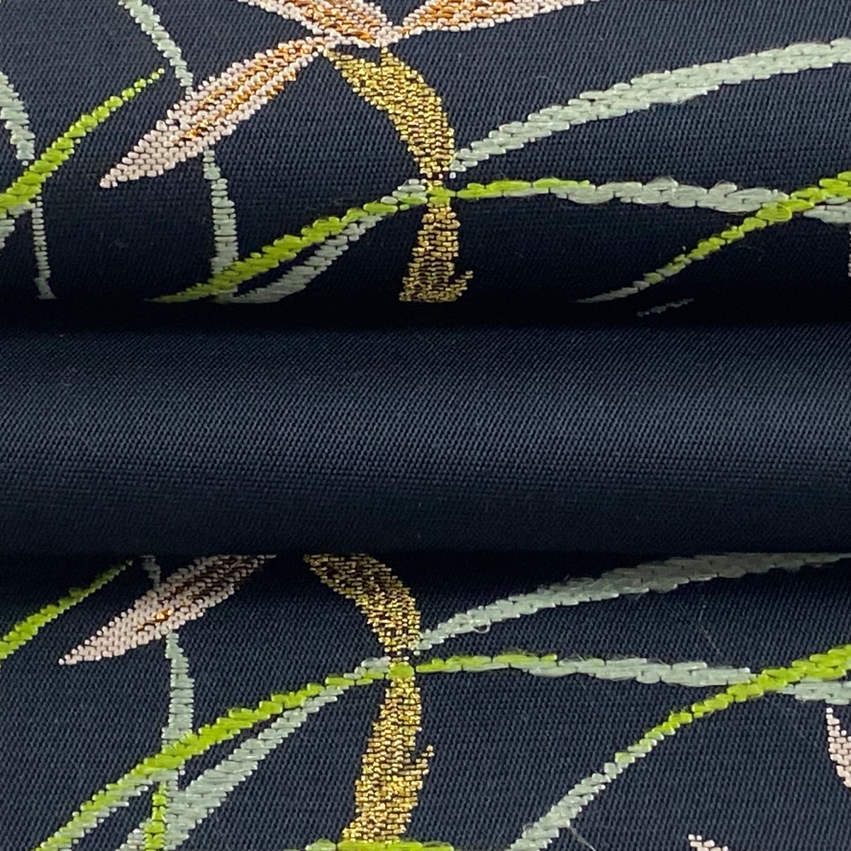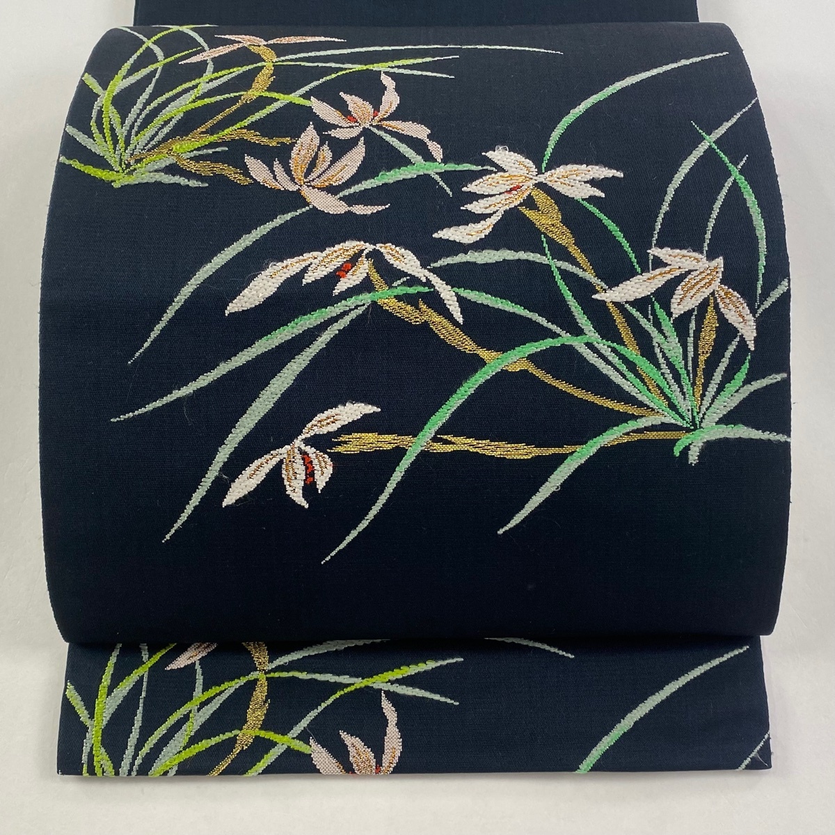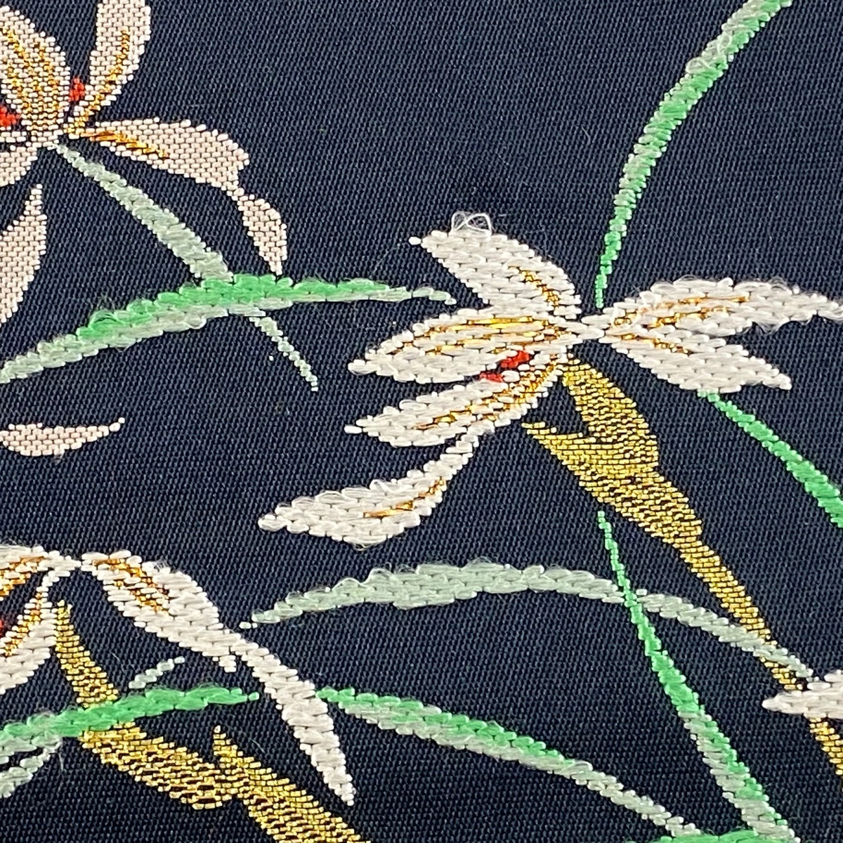 | 袋帯 逸品 龍村美術織物 落款 たつむら 草花 刺繍 金糸 黒 お太鼓柄 正絹 【中古】 |