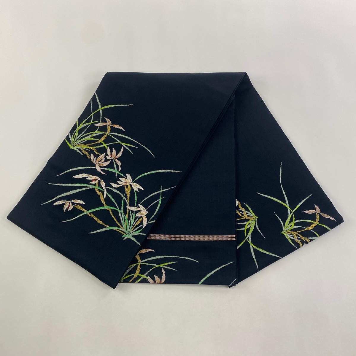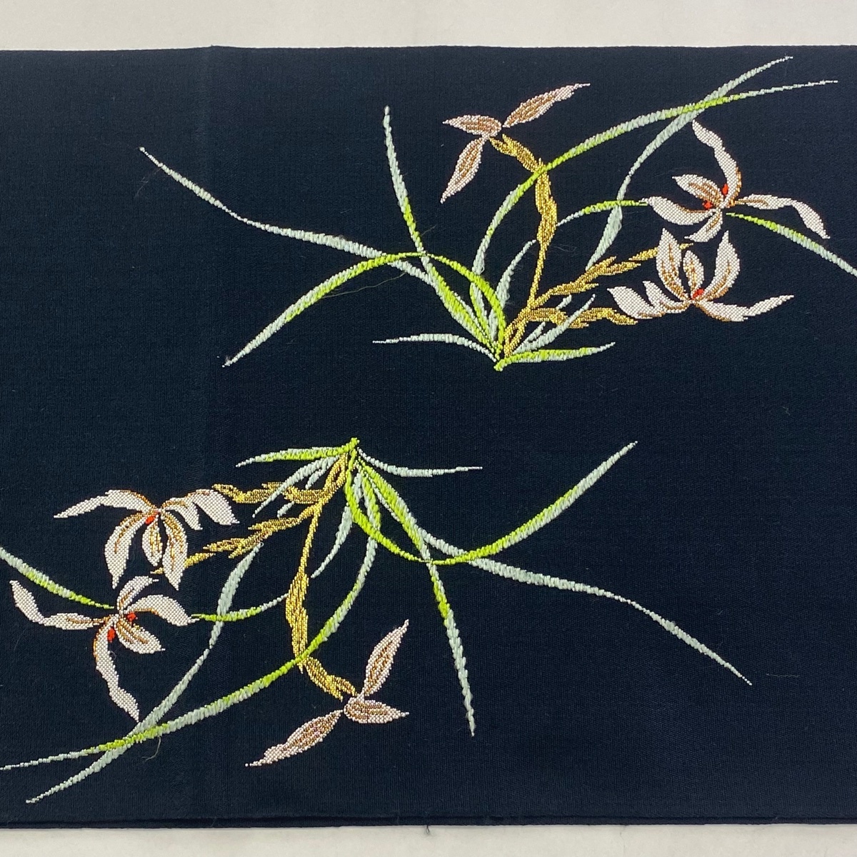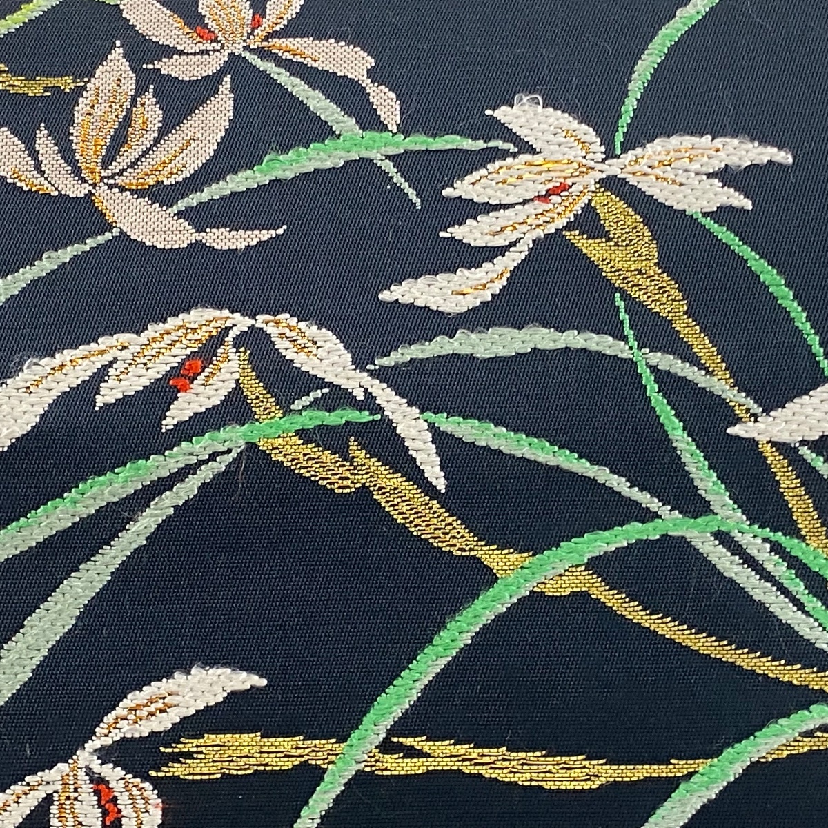 | 袋帯 逸品 龍村美術織物 落款 たつむら 草花 刺繍 金糸 黒 お太鼓柄 正絹 【中古】 |