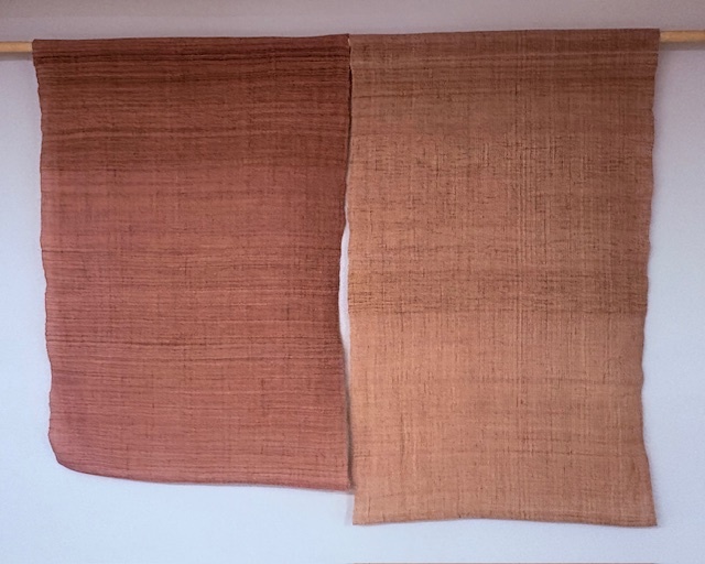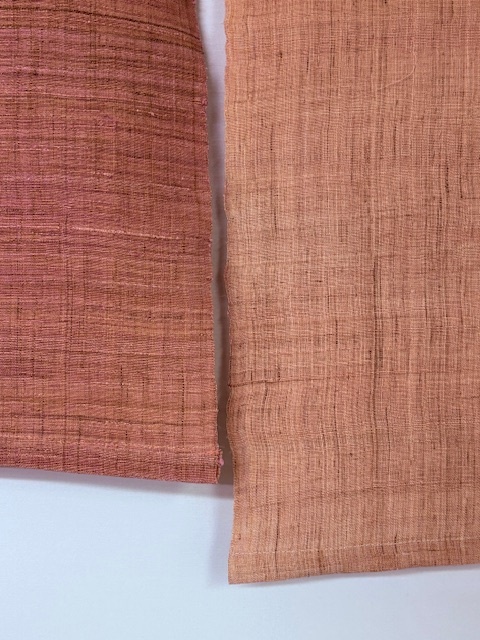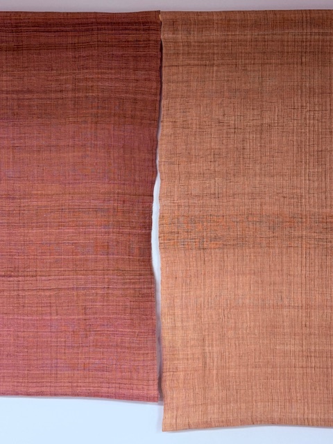 京染め“きびら麻無地のれん・赤紅色・約巾59cmx84cm・薄紅色・約巾55cmx丈90cm"。真ん中部分が繋がっていないので、一枚ずつ後使用出来ます。厳選された麻生地を手染めにて仕上げました。なんとも言えない自然の色合いです。