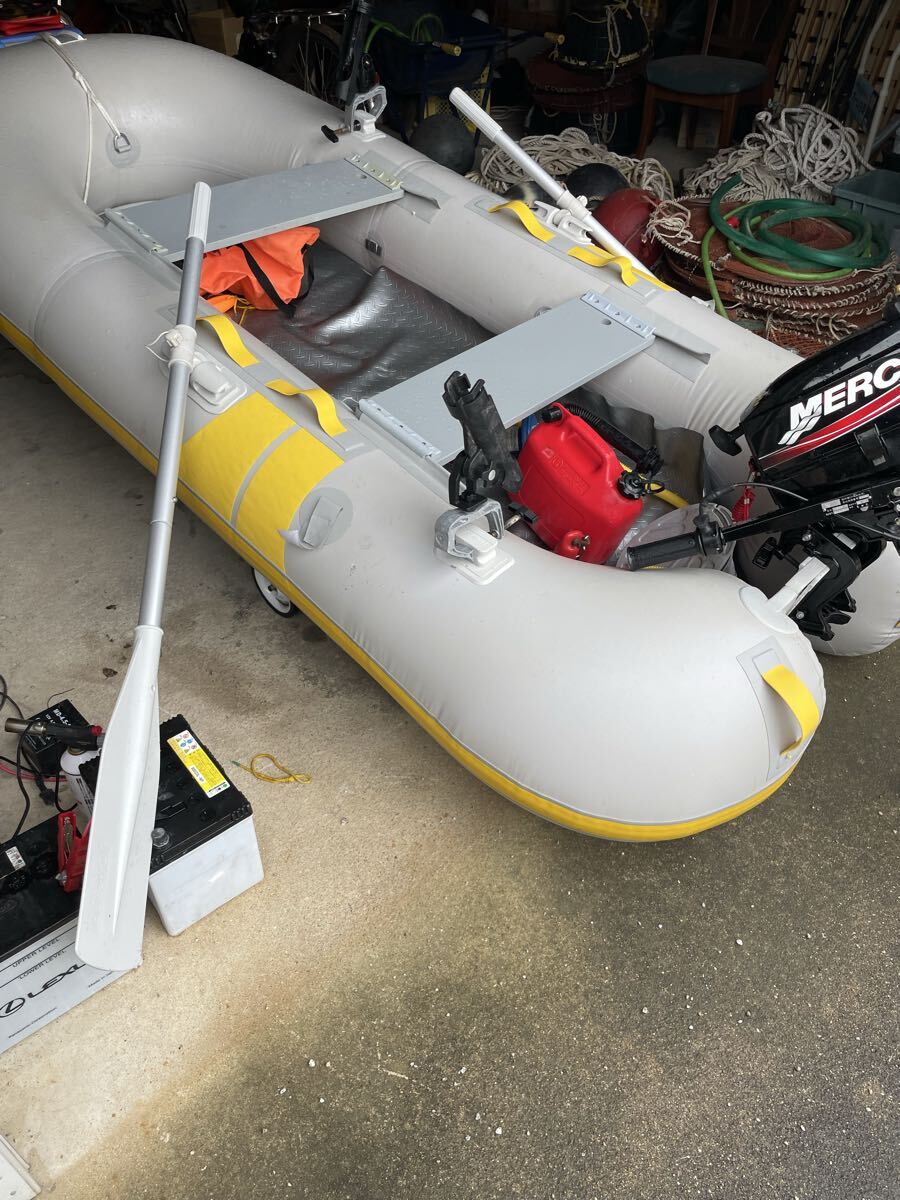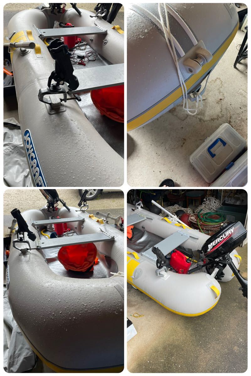 全部で200サイズでは収まらないので、ドリーや船外機スタンドや燃料タンクやアンカーその他付属品は ヤマト運輸で別口着払いでお送りします。船外機とボートはそのままお送りします。 写真には写ってないですがゴムボート収納バッグもおつけします ゴムボート本体重量(おおよそ23kg)