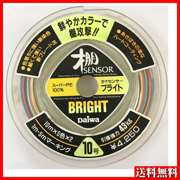 ★未使用品 ★メーカー= ダイワ ★品名= 棚センサー ブライト ★号数= 10号 ★長さ= 10m×5色×2 ★カラー= 1m・5mマーキング ★引張強力= 43kg ★本体価格= ¥4,250 |