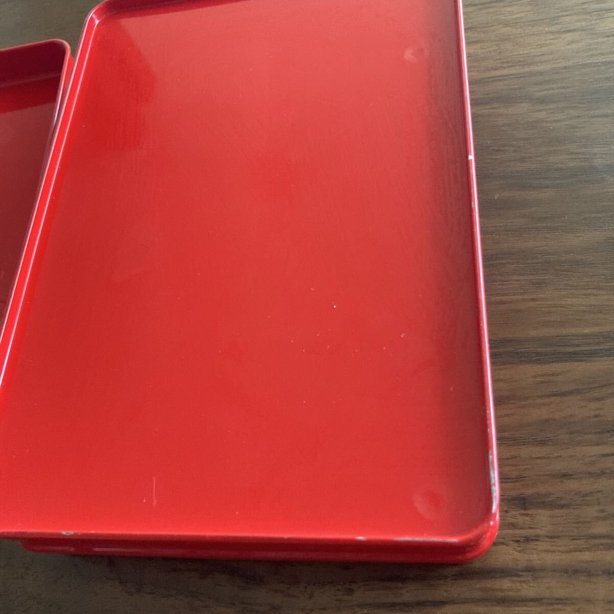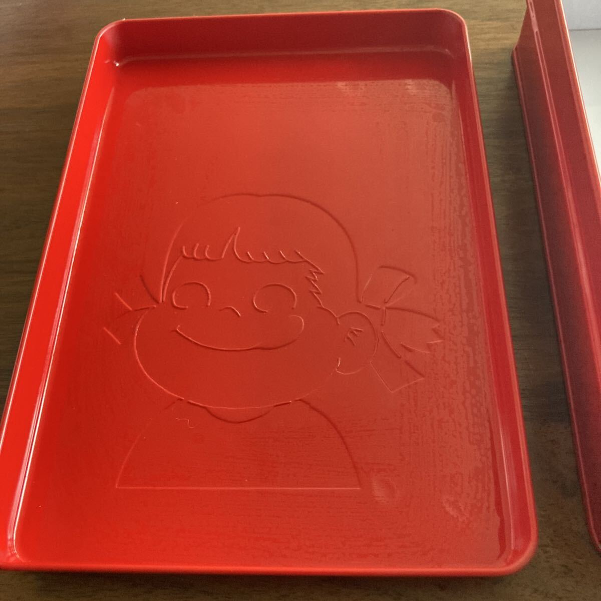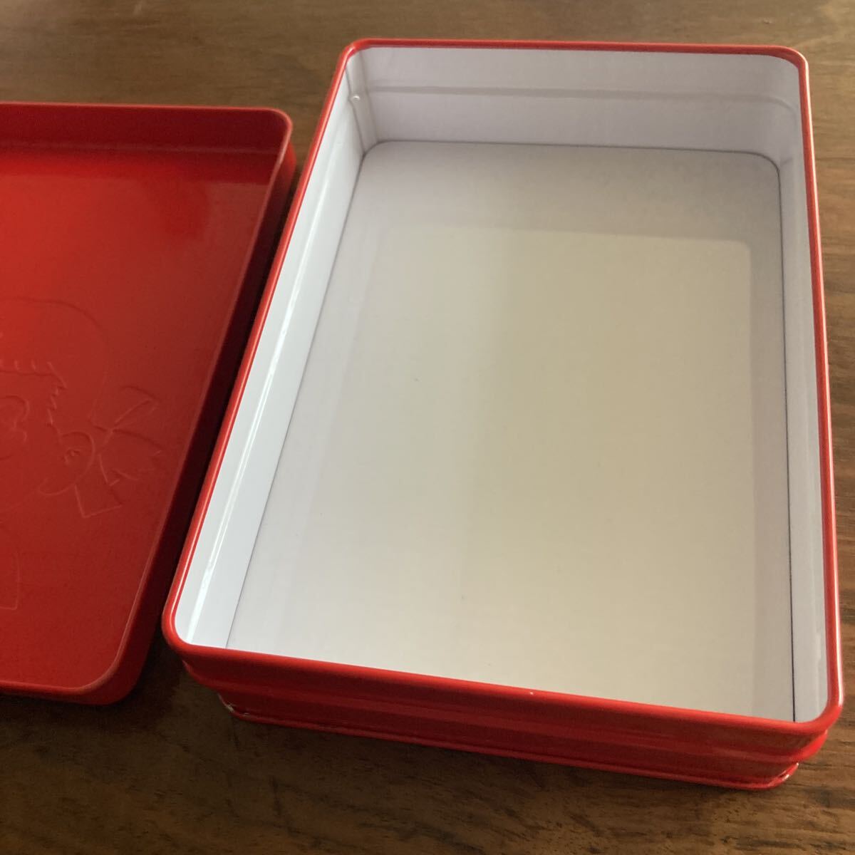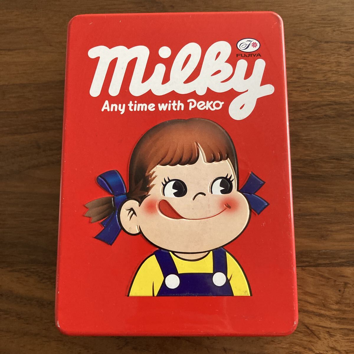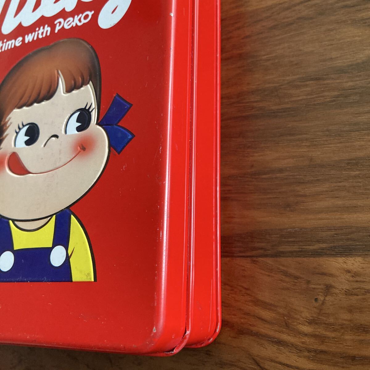 ペコちゃんのミルキー缶です。サイズは17×12×4cmです。目立つほどではありませんが角に剥がれ少々あります。