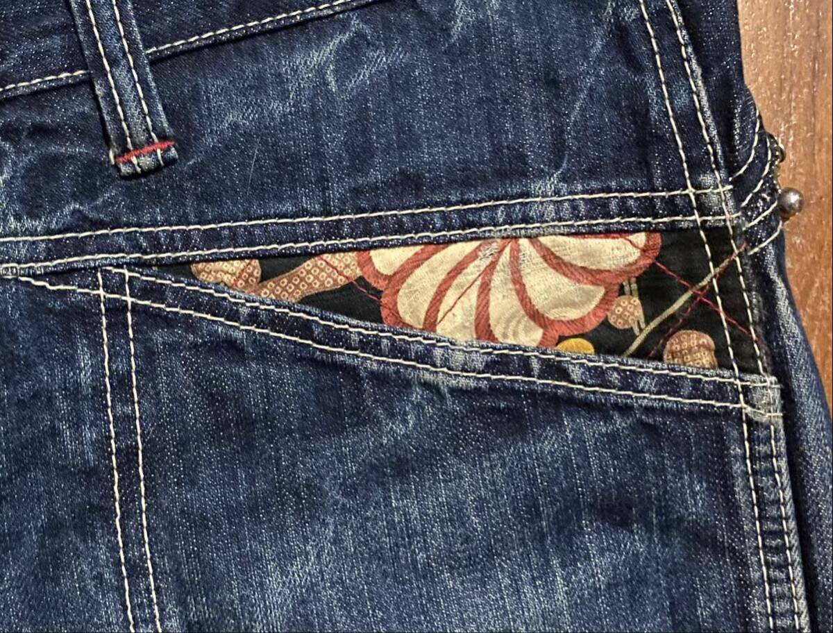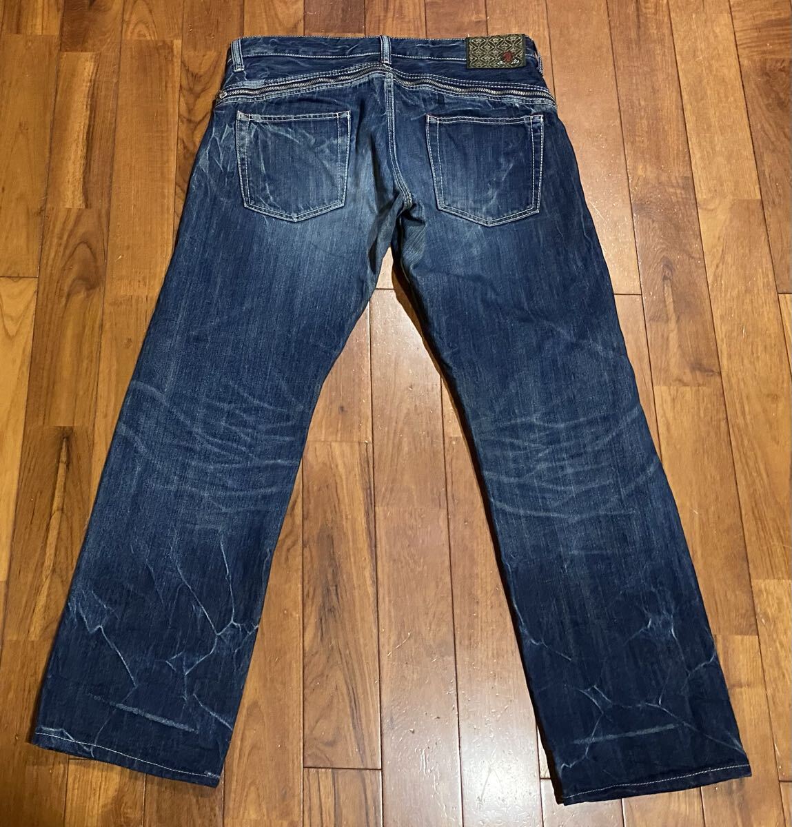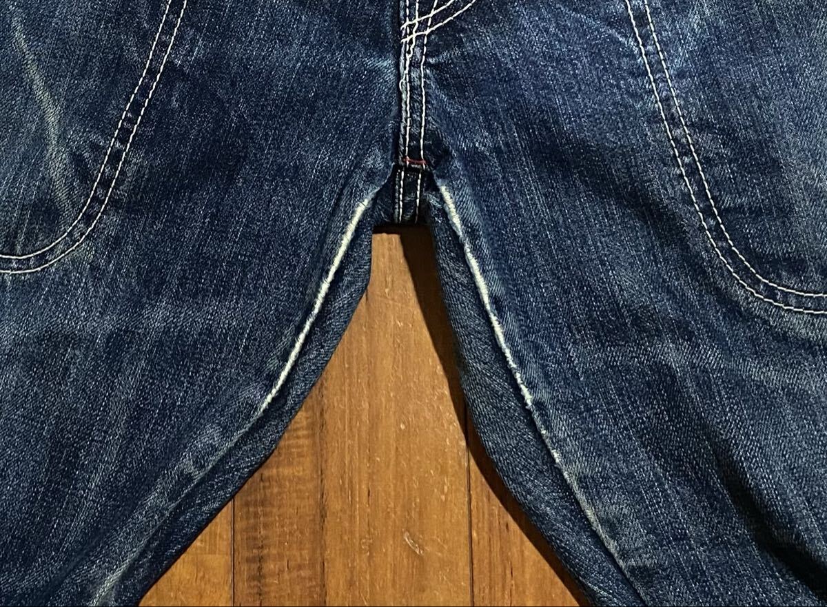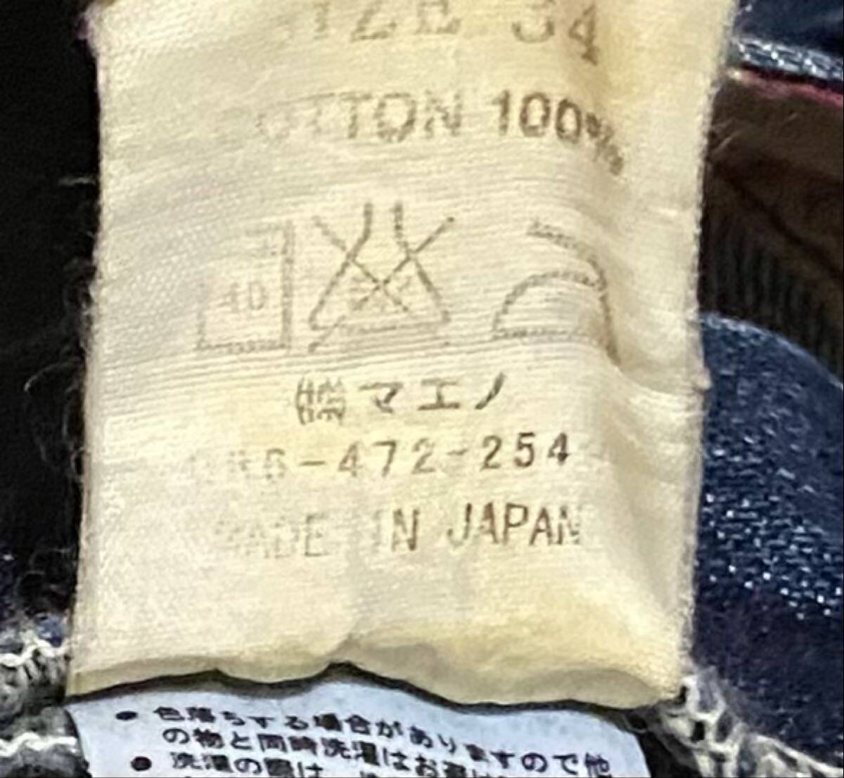 備中倉敷工房・エターナルのデニム(ジーンズ)、NO.24567です。色はインディゴブルーです。USEDで両前ポケットの布部分と股下部分に擦れありますがその他の状態は良いです(10段階中7程度)。ボタンフライです。生地は綿100%です。正規品です((株)マエノ、日本製)。サイズはW34でウエストは重ねずに平置きで約88cm、ヒップ約112cm、股上約23cm、股下約78cm、股下15cmのふともも部分約57cm、裾まわり約44cm、重量約770gです。発送はゆうパケットポストになります。