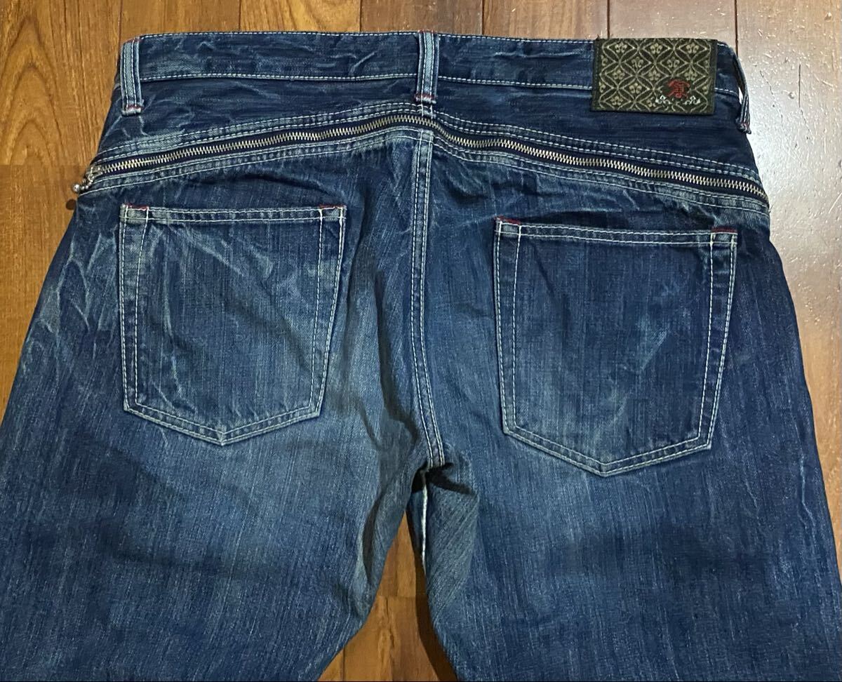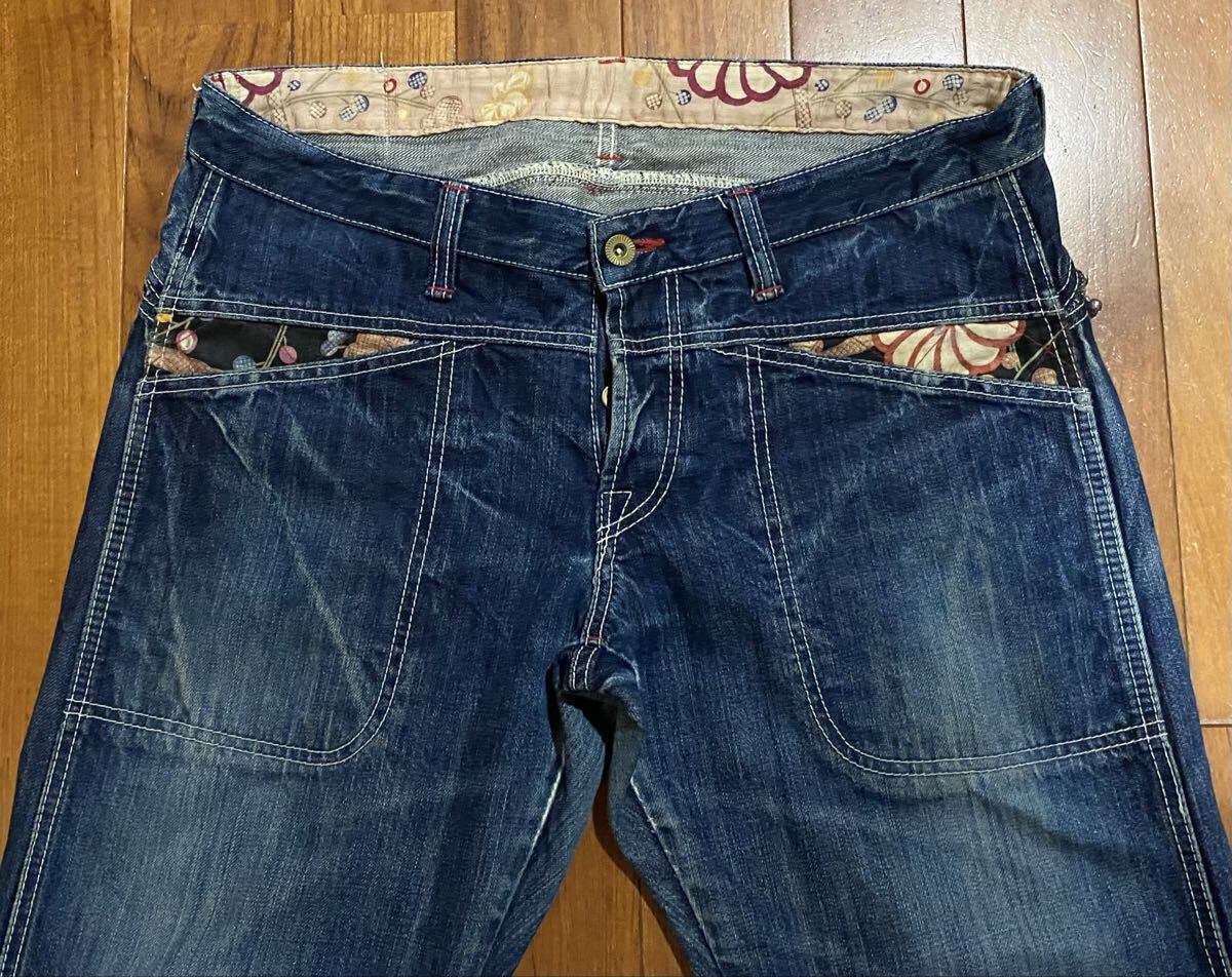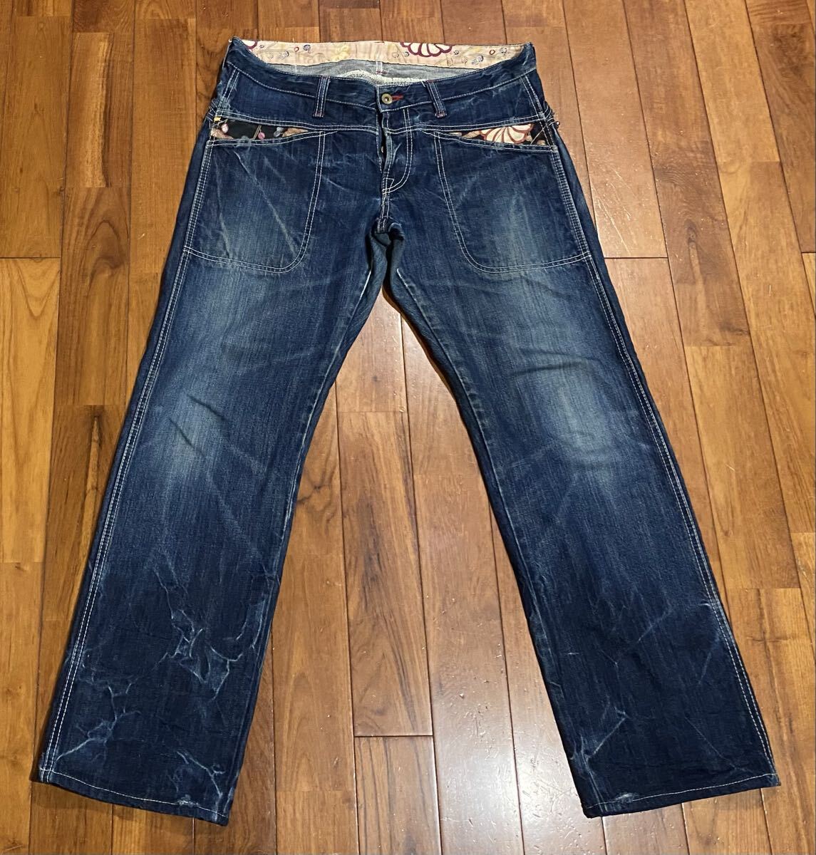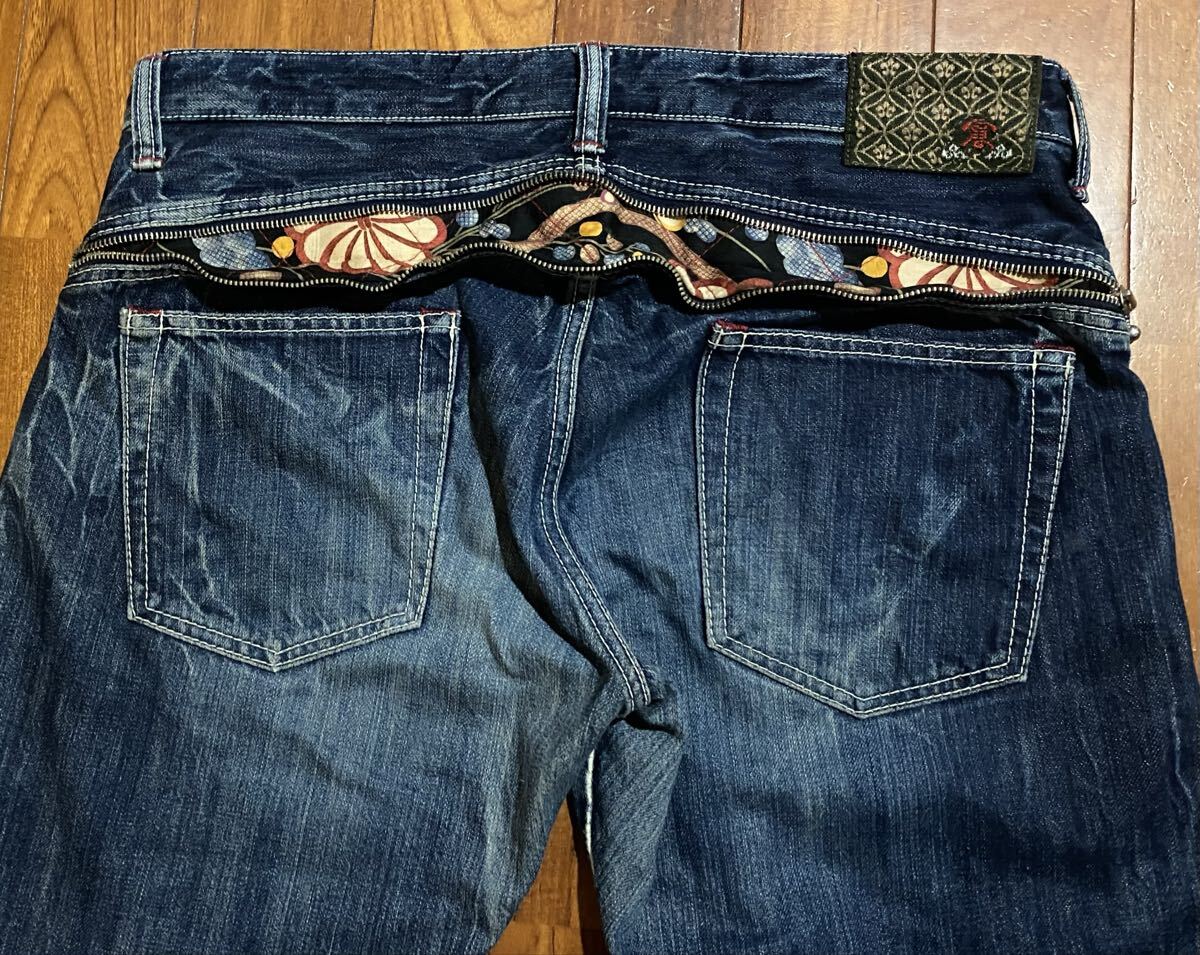 備中倉敷工房・エターナルのデニム(ジーンズ)、NO.24567です。色はインディゴブルーです。USEDで両前ポケットの布部分と股下部分に擦れありますがその他の状態は良いです(10段階中7程度)。ボタンフライです。生地は綿100%です。正規品です((株)マエノ、日本製)。サイズはW34でウエストは重ねずに平置きで約88cm、ヒップ約112cm、股上約23cm、股下約78cm、股下15cmのふともも部分約57cm、裾まわり約44cm、重量約770gです。発送はゆうパケットポストになります。