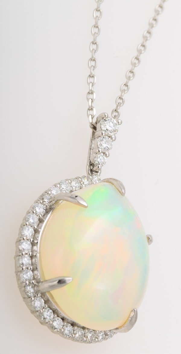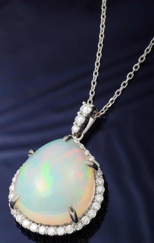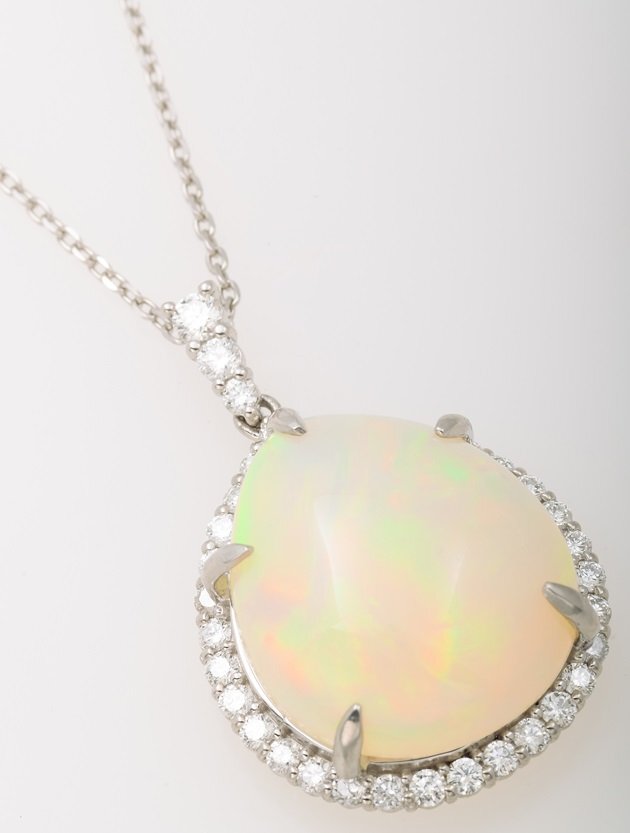 美しさに吸い込まれてしまいそうな10.58ctのオパールを、プラチナ(900)の台にセットし、まわりを合計0.82ctのダイヤモンドで飾っています。