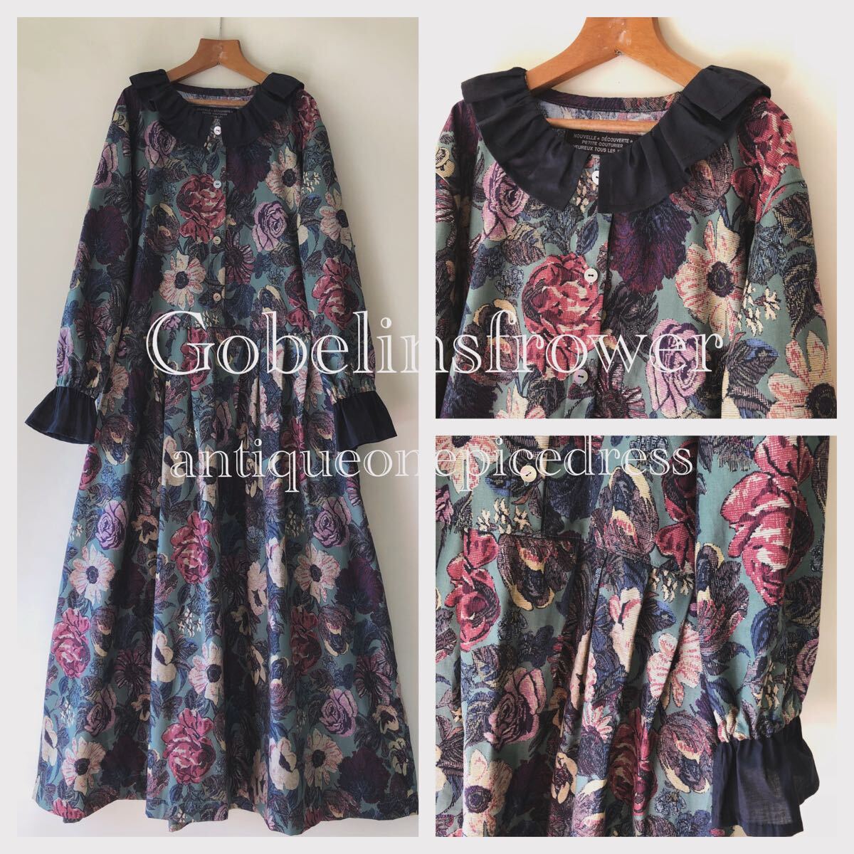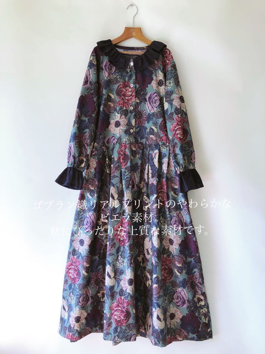 秋物★着丈オーダー★柔らかなゴブラン織プリントフリル衿タックスカートワンピースエレガント花柄秋ワンピースローズrelume ADIEU