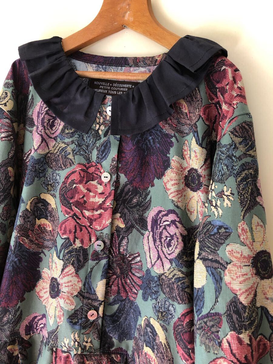 とても素敵なゴブラン織プリントの花柄で衿元フリルの大人ワンピースを作りました。袖口もフリル。 今回秋物として作りました。 こちらの素材とても素敵です。柔らかくて色柄がすごくお洒落です。高級感あり。アンティークワンピの様な雰囲気に仕上がりました。エレガントな花柄 ゴブラン織の様なプリントの珍しい素材。柔らかなコットンビエラ生地。色柄質感とても良いです。 ベースのアンティークグリーンがとても素敵な色です。 花柄の感じも素敵で高級感ある雰囲気に仕上がりました。少し斜め方向に微ストレッチ。 とても落ち着いたカラーや柄で毎年着ていただける雰囲気。 今回の出品でおススメの一枚です。 綺麗に仕上がってます。 質感や柄とパターンが相性良く仕上がりました。質感はコットンで柔らかいきちんと感もある良い素材です。透け感を気にせず着て頂ける素材。 衿元はフリル衿仕上げ(ブラックネイビー) タック切替のスカートのワンピースです。袖は手の長さにもよりますが、長袖になるかと思います。 こちらのパターンですがアームホール袖幅ゆったりサイズで着やすい形です。 スカート部分もふんわりしすぎないシルエット。毎年着て頂けます。 今から着て頂けます。薄すぎず厚すぎないちょうど良い素材感。衿元と袖にフリルをつける事でお洒落感のある1枚になりました。 色柄ともにとても素敵な絵柄です。 ポケットあり。 おすすめの一枚。 是非ご検討になってみてくださいね! サイズ:身幅・約58センチ(後で計測) 着丈約118センチ 袖丈約38センチ(脇下から袖口まで)素材 コットンビエラ(コットン100%) ★オススメサイズ L .LL .XLの方向き ●即決価格を用意いたしました。即決での方は送料無料にさせていただきます。 どうぞよろしくお願いいたします。 ★個人差ございますが綺麗に仕上がっております。 〇ハンガーに吊るした状態で計測しておりますので多少の誤差はお許しくださいね。 〇ハンドメイドですのでご理解のあります方にご入札いただきますようよろしくお願いいたします。