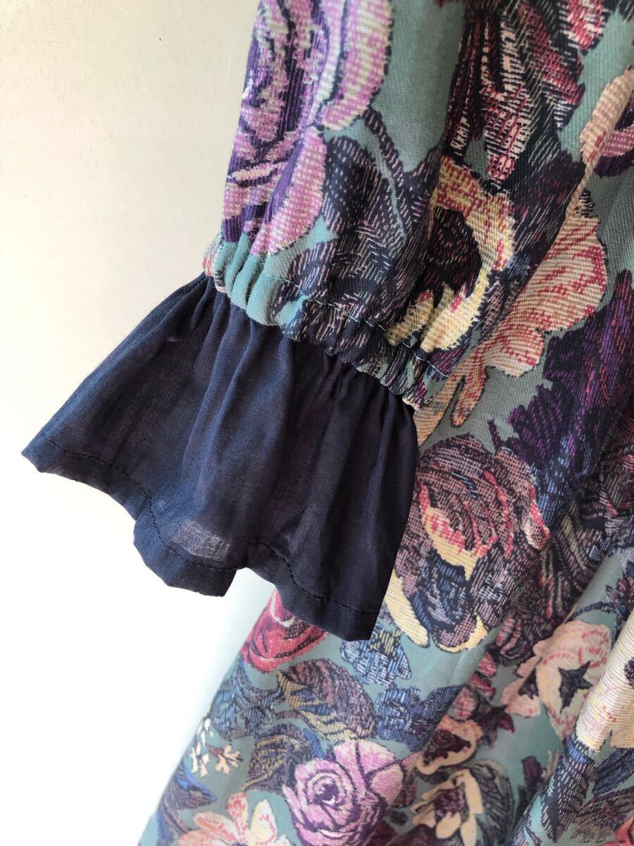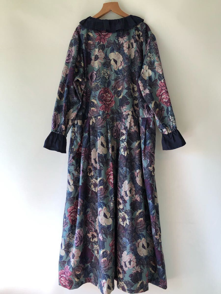 上質ビエラ柔らかなゴブラン織プリント衿元フリルタックスカート切替ワンピース(アンティークグリーン)1点物(丈上げ可能118センチ以内ご希望の着丈オーダー)