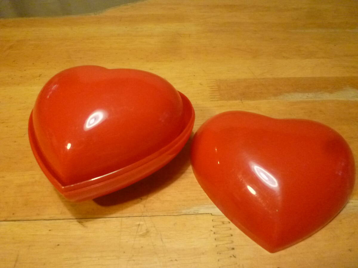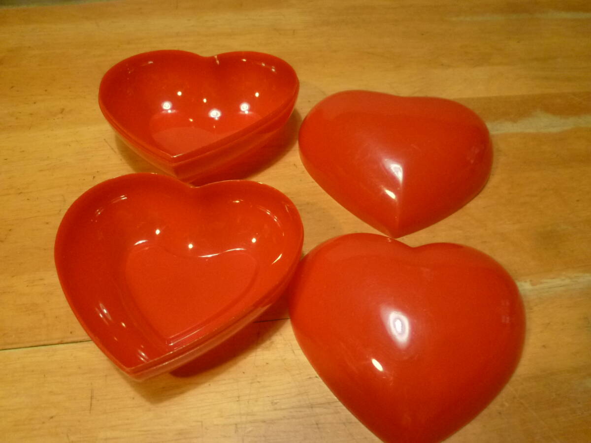 こちらはプラ製の真っ赤なハート型小物入れで、中にも同タイプの小物入れが入っているものです。2個としてもフタも利用の4個としても素敵だと思います。