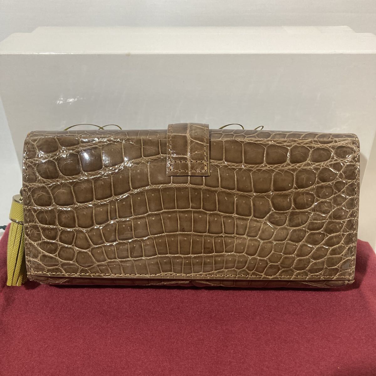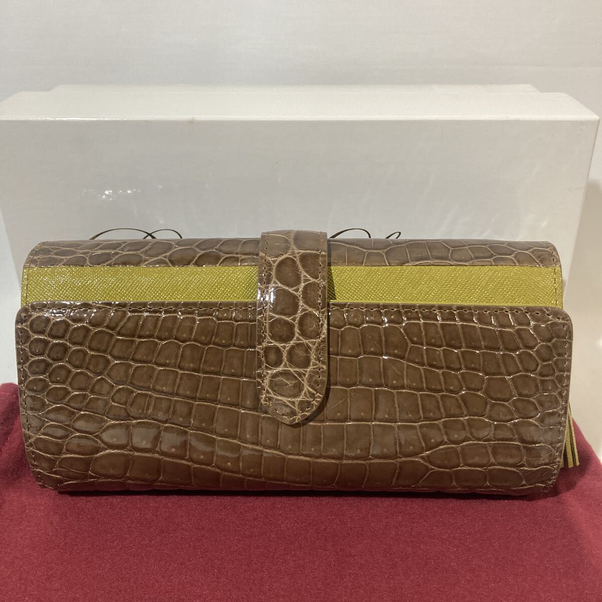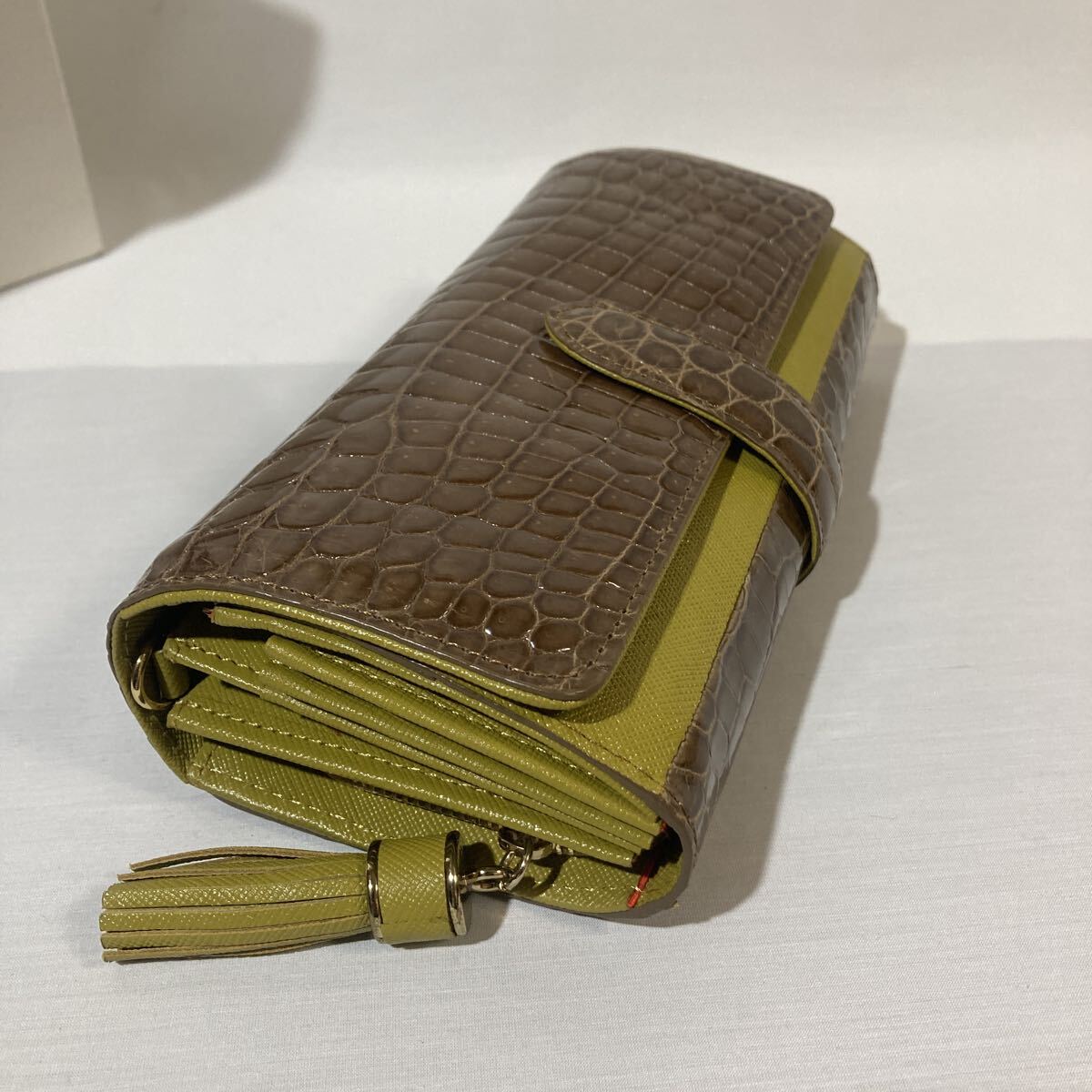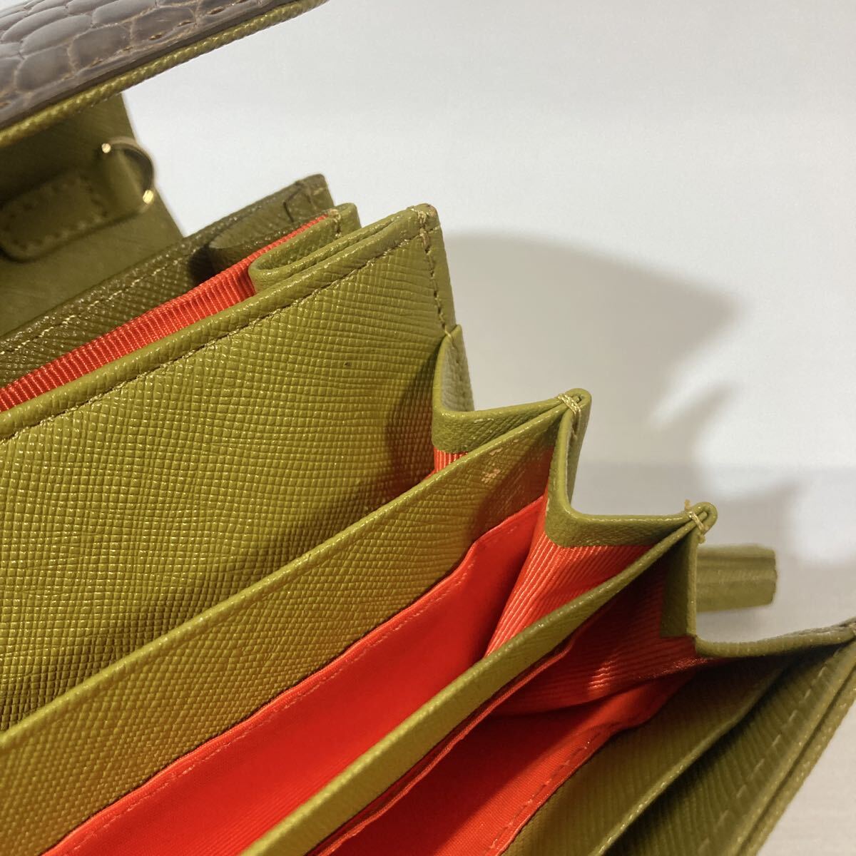 ショルダー紐付き。未使用、保管品の為、財布を開ける時に折り目部分革の離れる音が若干しますがベタ付きはありません。一部少し革の剥がれがあります。未使用品になりますが以上ご理解の上よろしくお願いいたします。