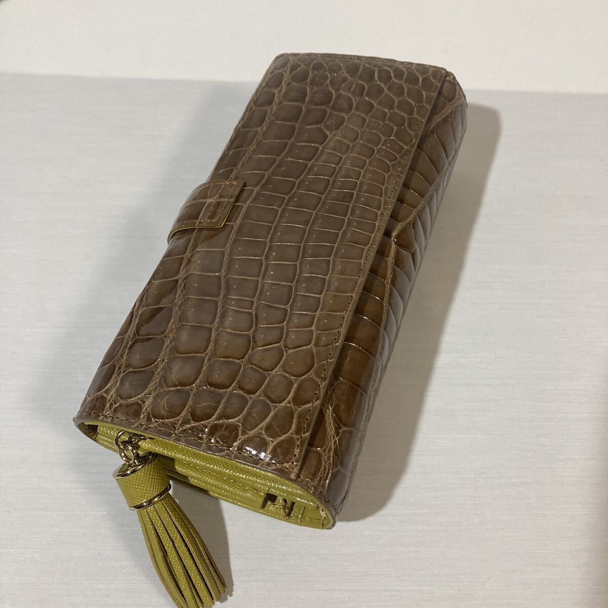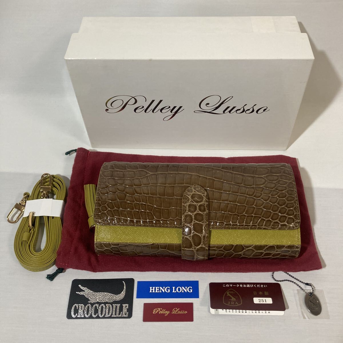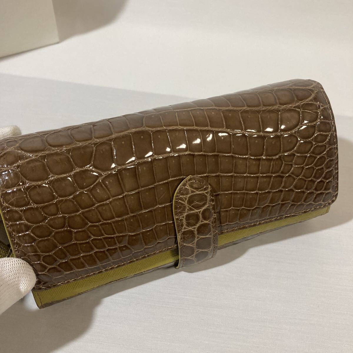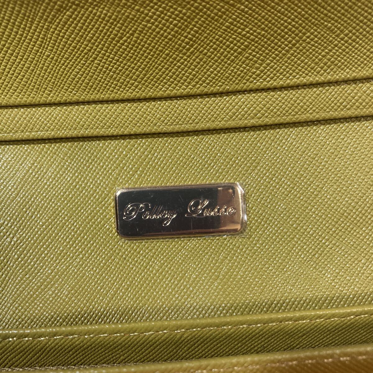 ショルダー紐付き。未使用、保管品の為、財布を開ける時に折り目部分革の離れる音が若干しますがベタ付きはありません。一部少し革の剥がれがあります。未使用品になりますが以上ご理解の上よろしくお願いいたします。