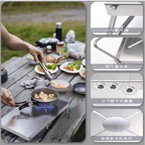 【一台多役&四種類バーナー対応】:折りたたみ式テーブルと四種類バーナー兼用な遮熱板です。アウトドアの定番道具としてのSOTO st310バーナーの使用者のため、こちらの遮熱テーブルが誕生されました。しかも、SOTO st310だけではなく、SOTO st330、イワタニジュニアコンパクトバーナー、trangia(トランギア) アルコールバーナー及び同じ形のアルコールバーナーも取付できます。ステンレス製の遮熱板は遮熱性が高く、カセットボンベ上部のデッドスペースがミニテーブルとしてつかえます。しかもゴトクもきちんと安定させられます、クッキングしながら、お皿やカップなどは置くことができます。