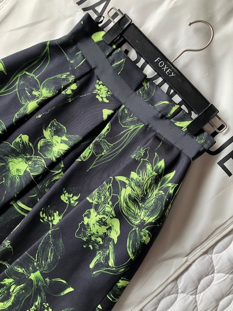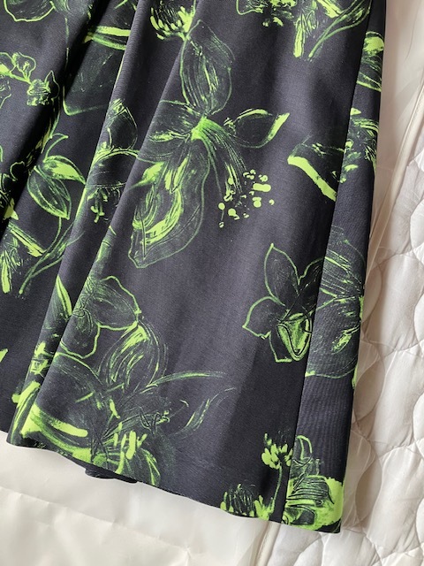 ウエスト部分にグログランリボンがあり、ネイビーにグリーンのお花模様がとても素敵です。