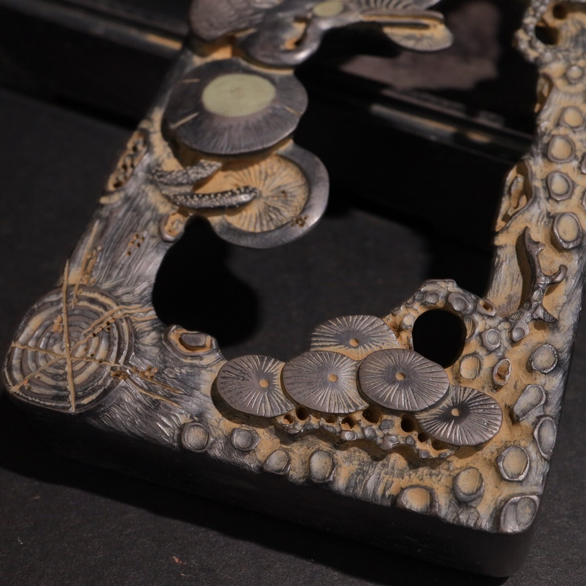「古端石硯 松鶴延年文房端渓蓋硯 繆とう銘 清時代」手彫り 文房四宝 書道具 中国古美術 旧蔵出