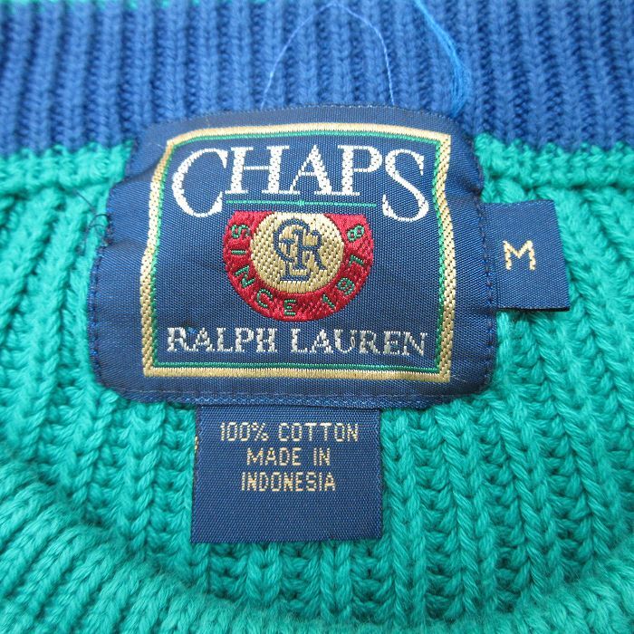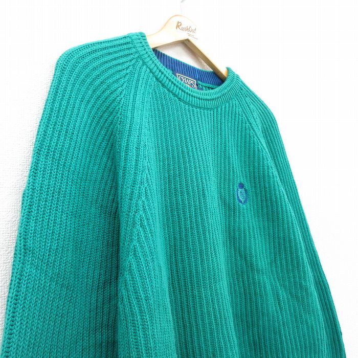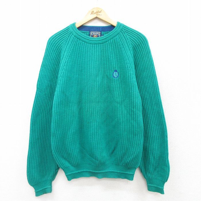 【商品名】 M★古着 ラルフローレン チャップス 長袖 ブランド セーター メンズ 80年代 80s ワンポイントロゴ コットン クルーネック 青緑